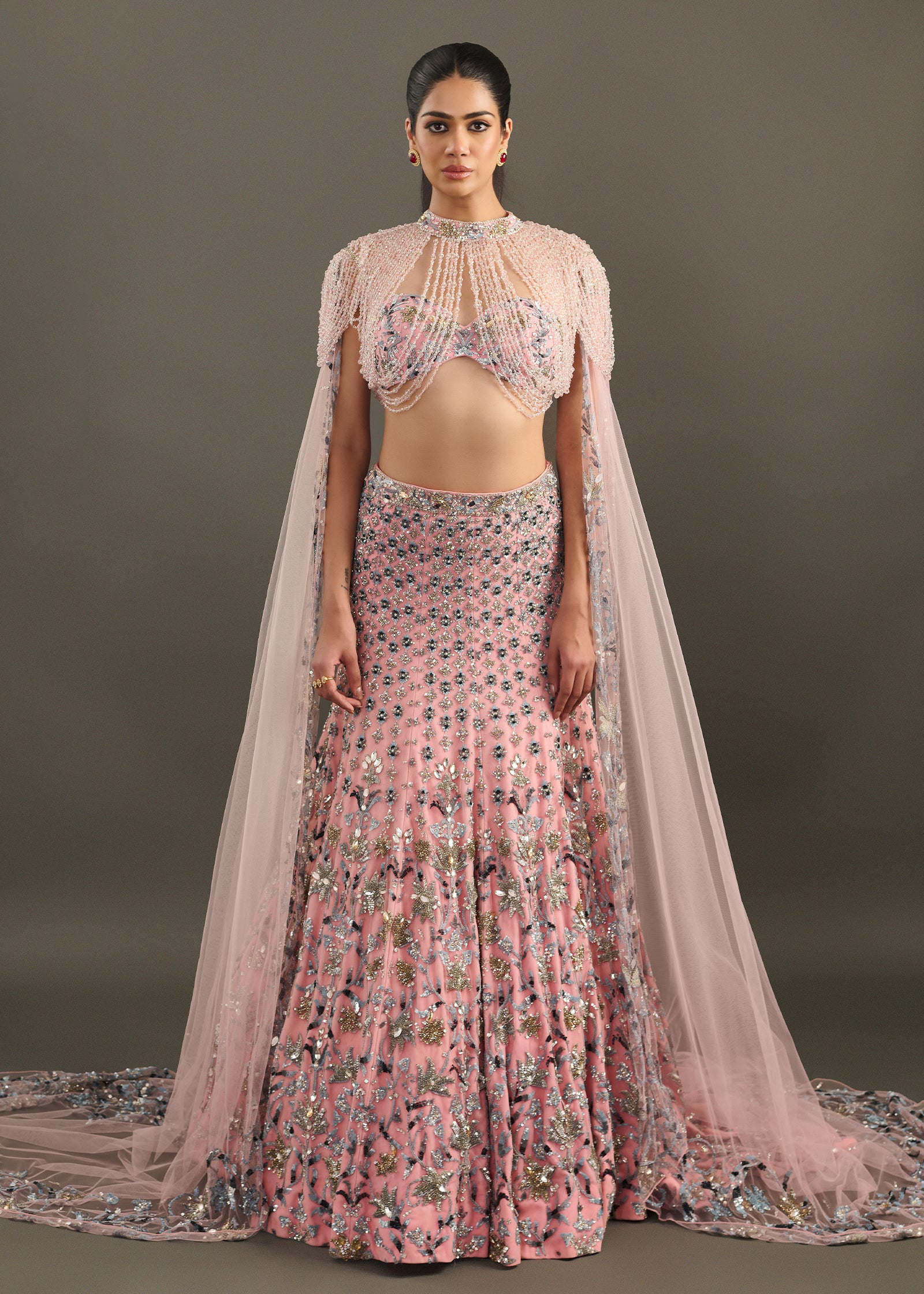 Light Mauve Embellished Lehenga Set with Beaded Floor-Length Cape