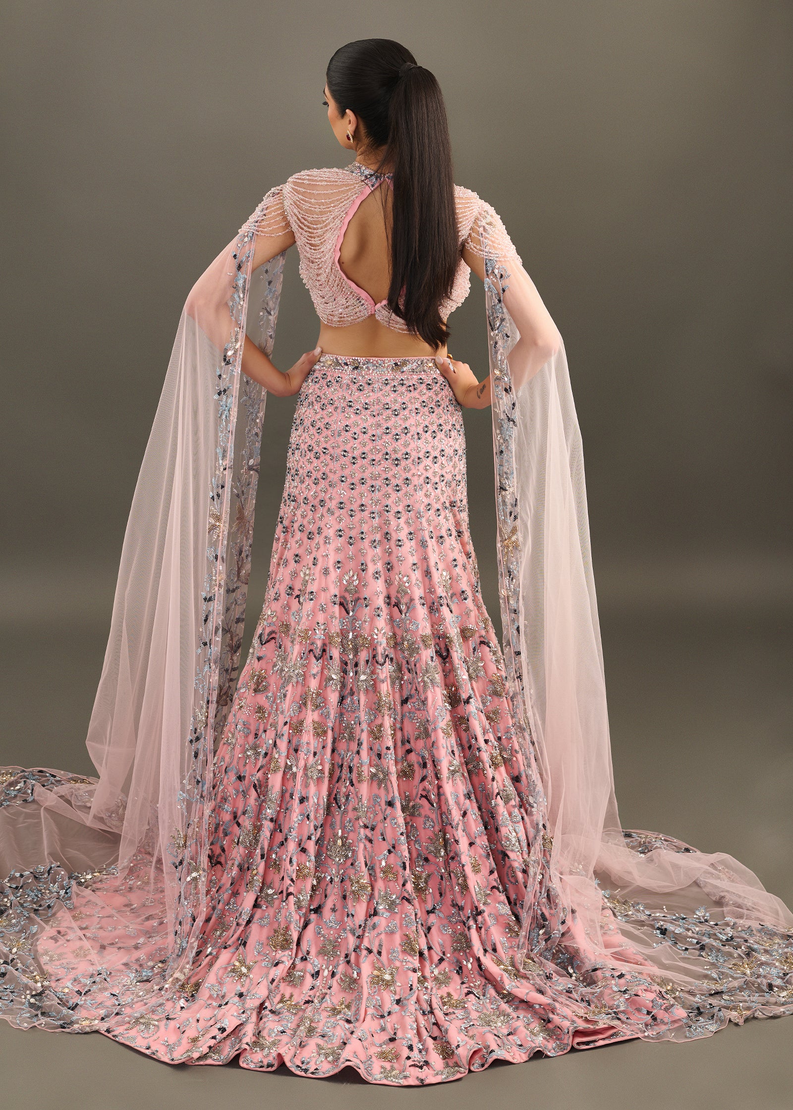 This is a modern and couture-inspired lehenga set in a delicate light mauve color, distinguished by its dramatic cape. The lehenga is heavily embellished with scattered silver, gold, and light blue sequins and beads, creating an intricate floral or nature-inspired pattern across the skirt's surface. The top consists of a heavily embellished cropped bralette and magnificent, sheer floor-length cape. The cape attaches at the shoulders and features dense bead and pearl work around the neckline, creating a sophisticated choker effect. This striking, contemporary silhouette is perfect for a modern reception, a high-fashion sangeet, or a formal evening gala.