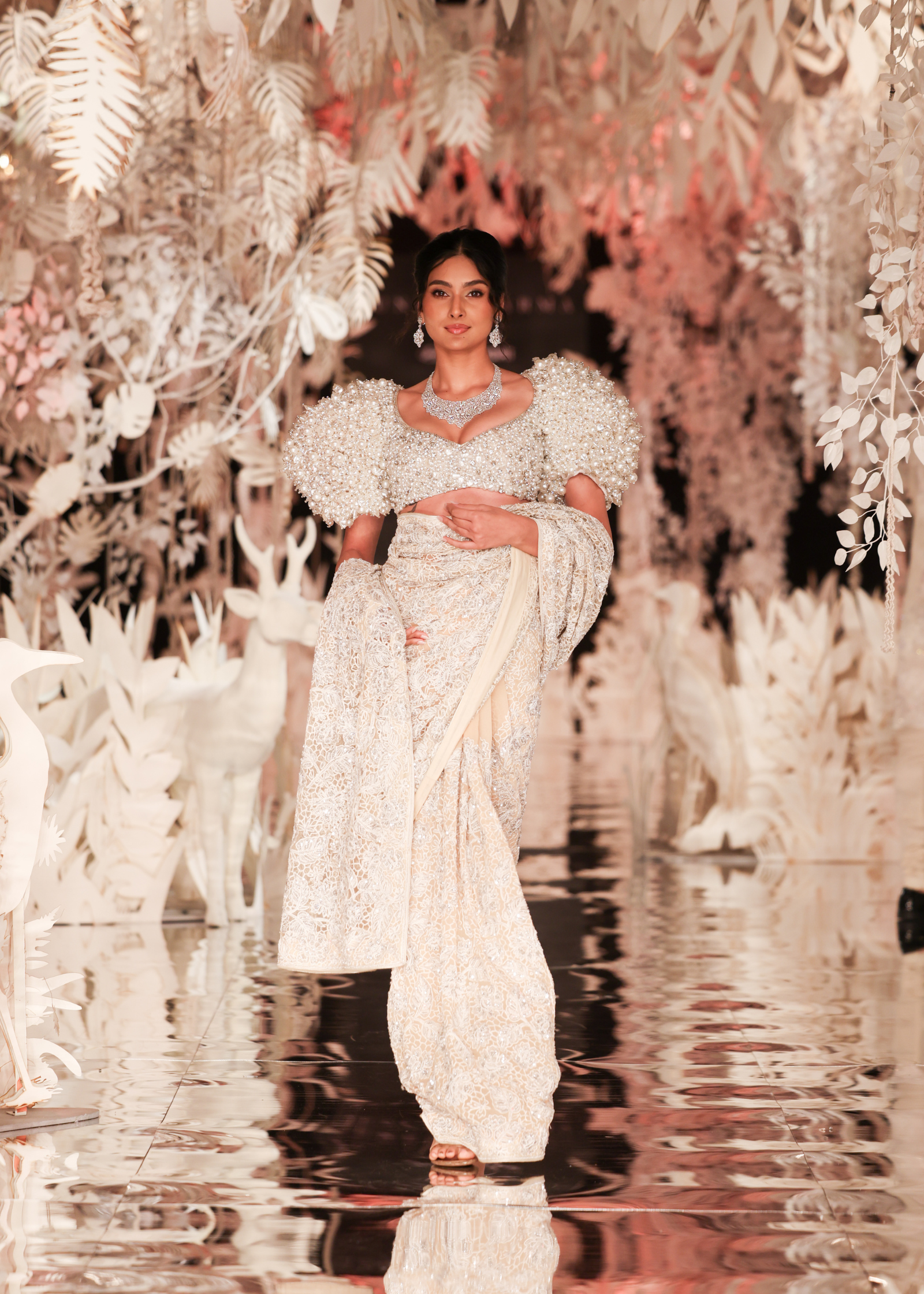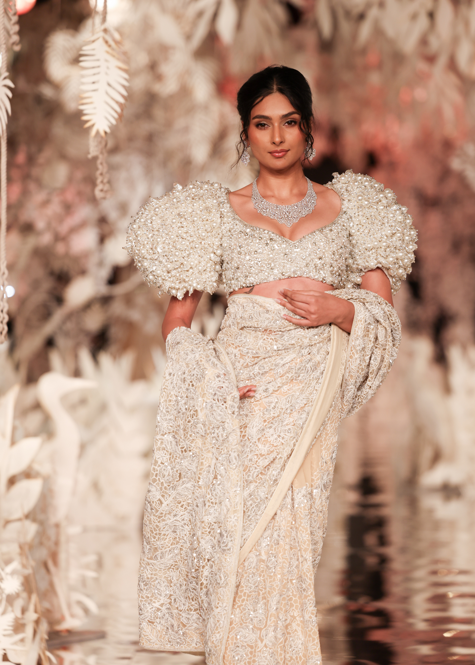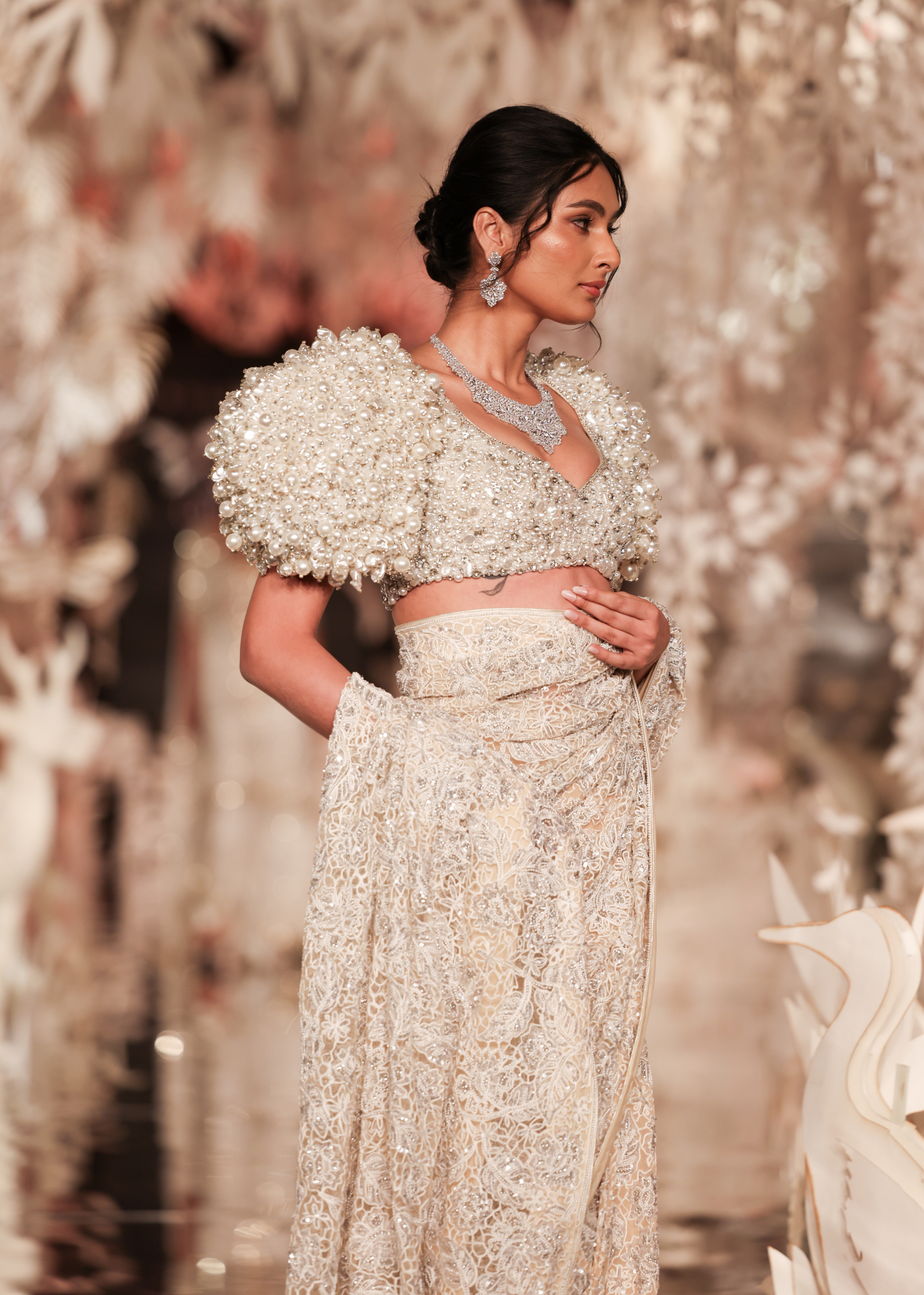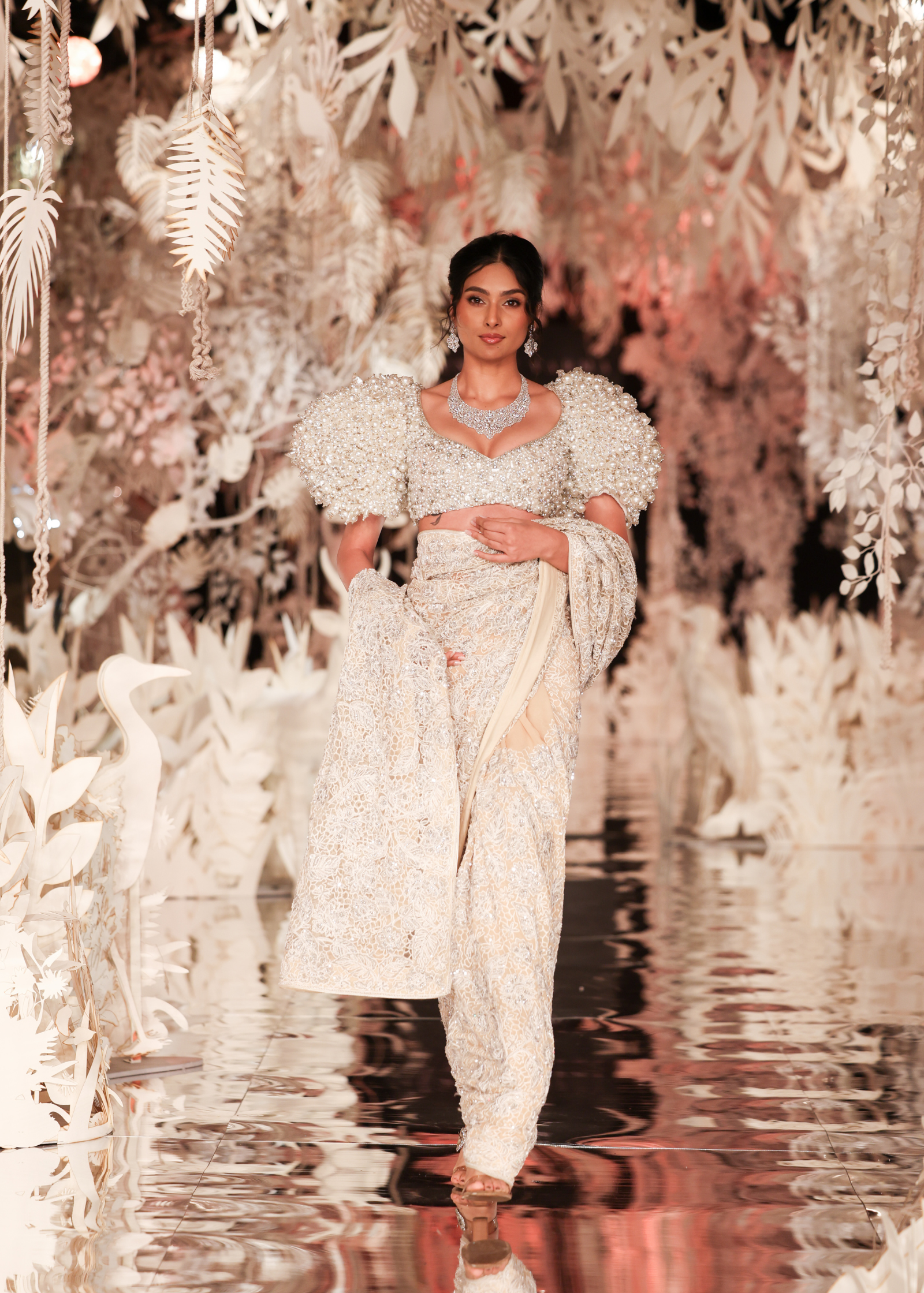 A contemporary saree ensemble featuring a full-length saree with intricate embroidery and a heavy, ornate border in silver and white. The saree is paired with a stunning blouse with dramatic, voluminous sleeves crafted from clusters of pearl-like beads. This opulent and modern look is perfect for a sangeet or a reception.