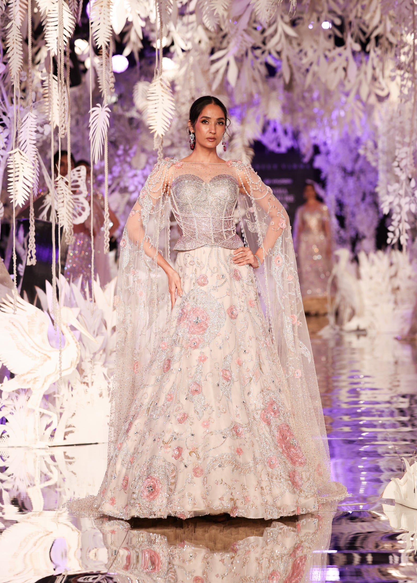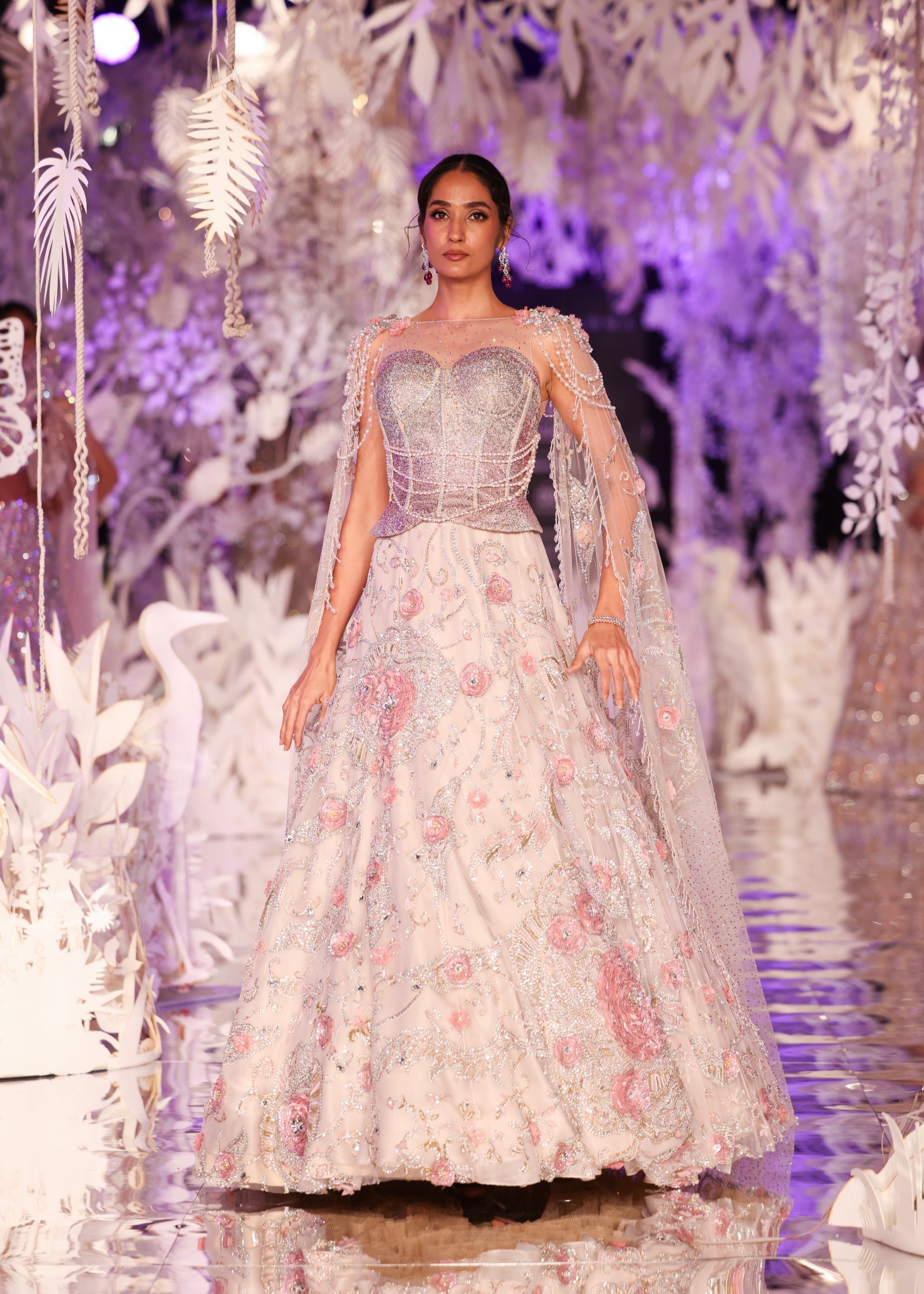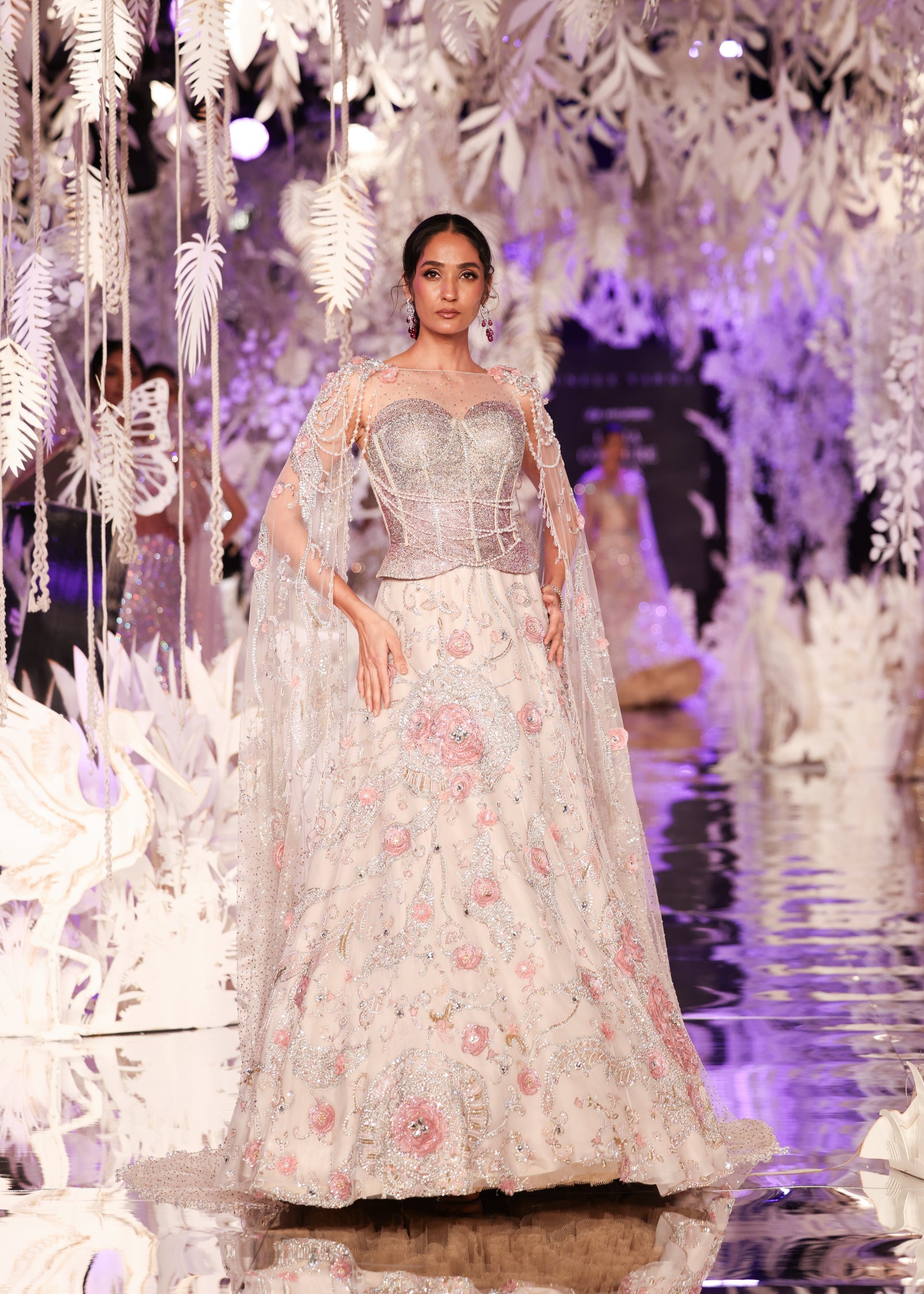 Nude Pink Swarovski Lehenga and Corset Blouse with Casacdes
