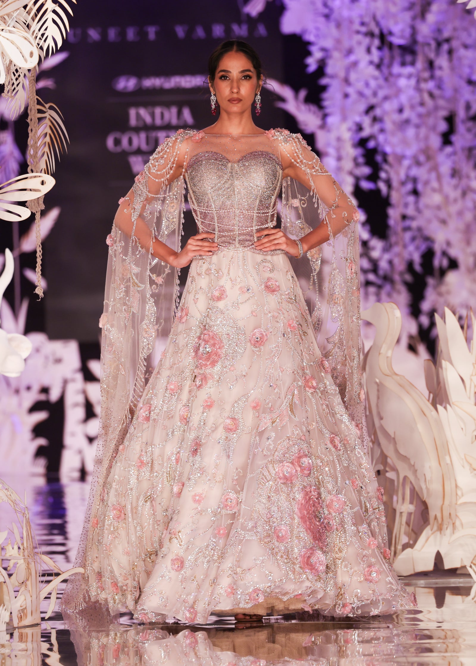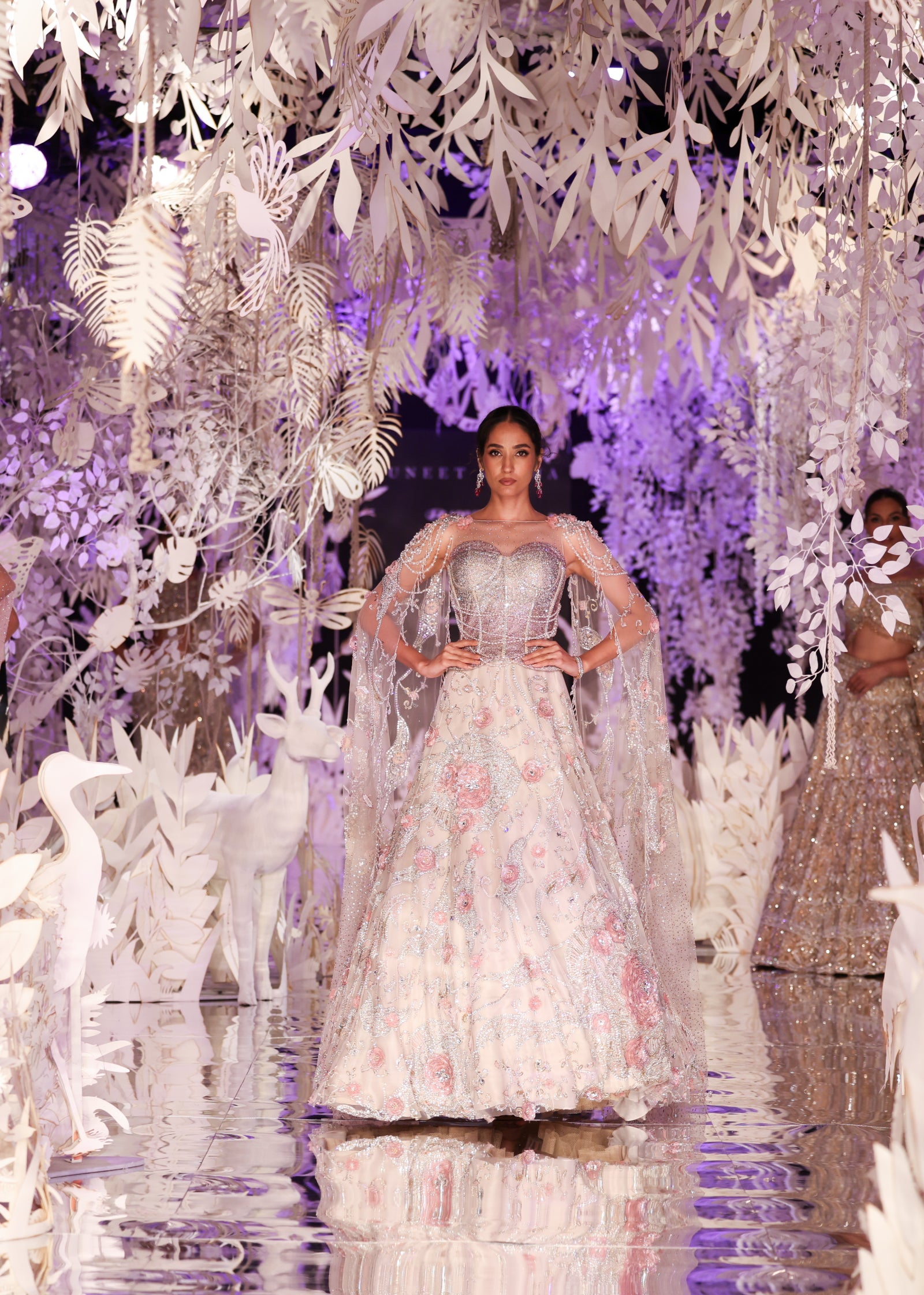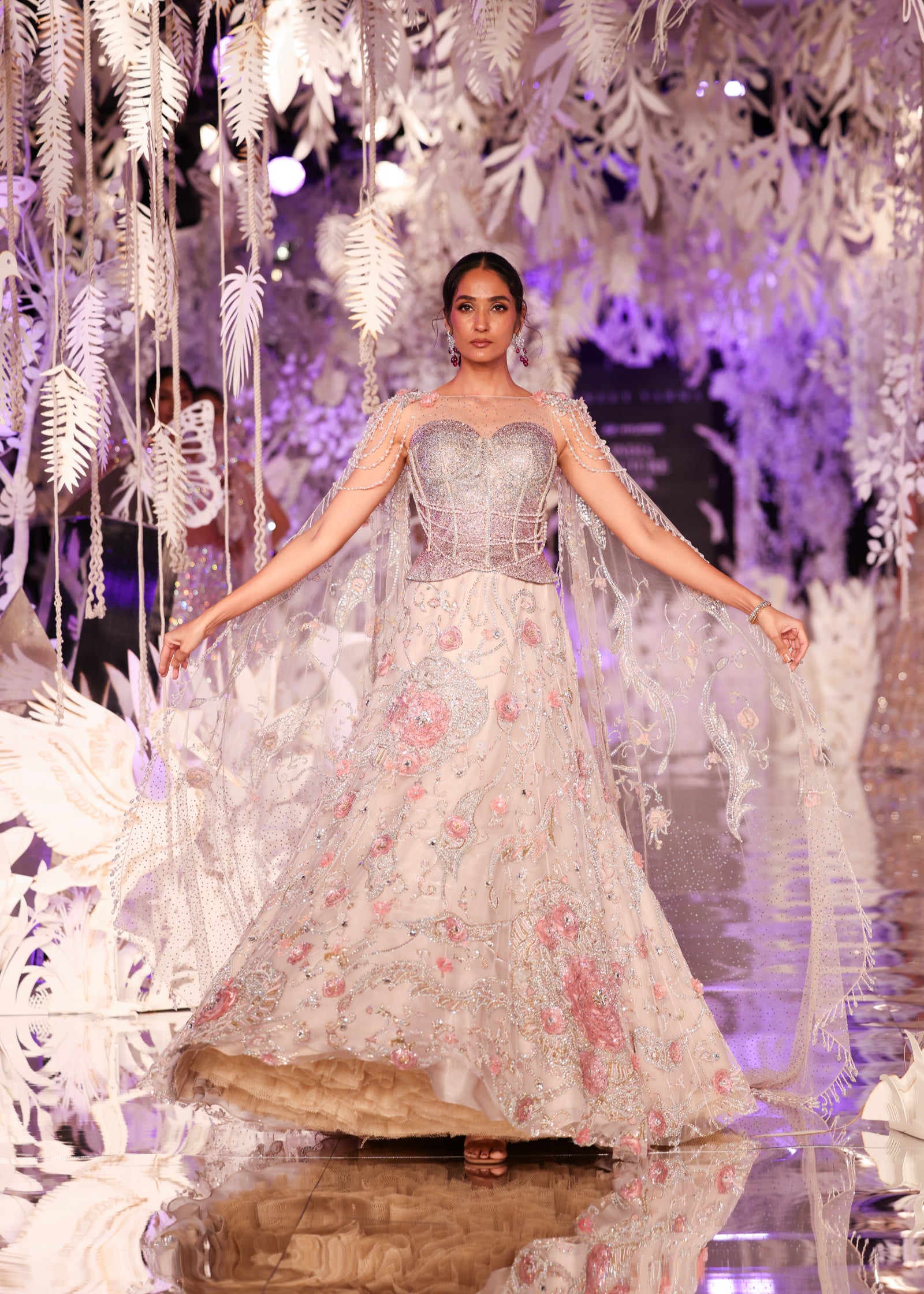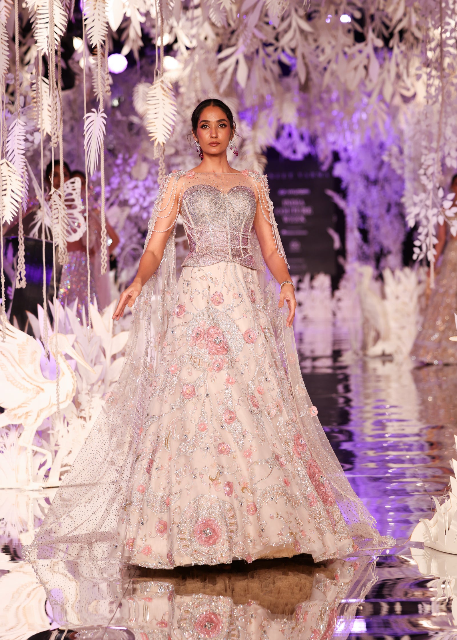 Nude Pink Swarovski Lehenga and Corset Blouse with Casacdes