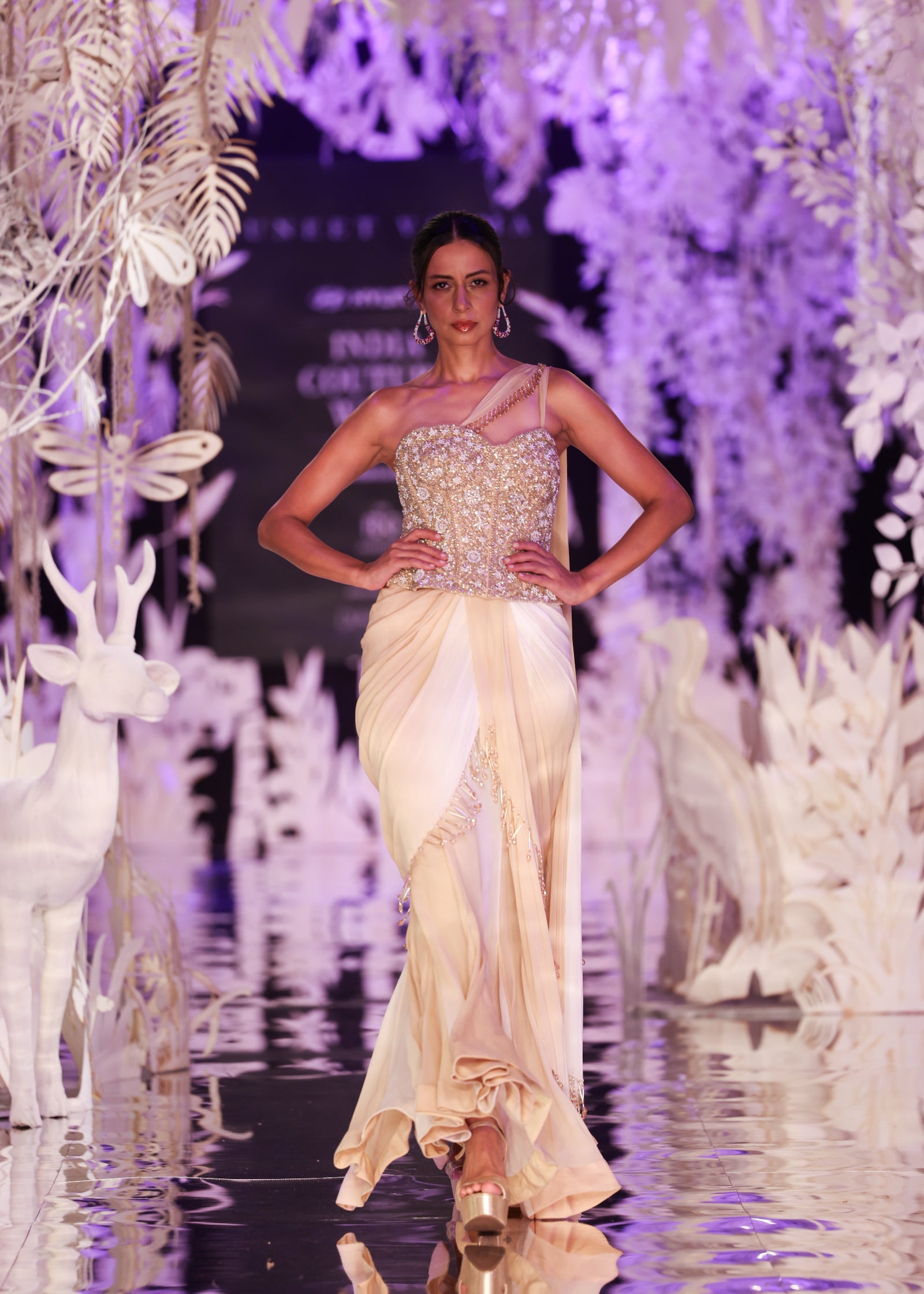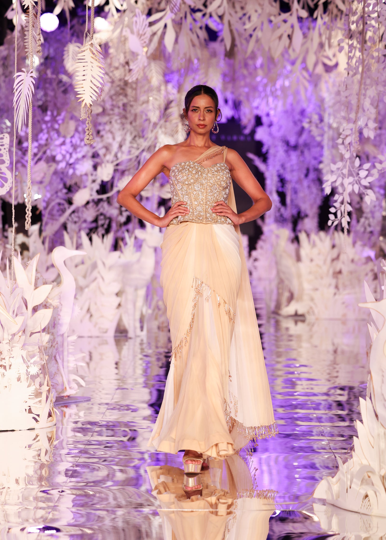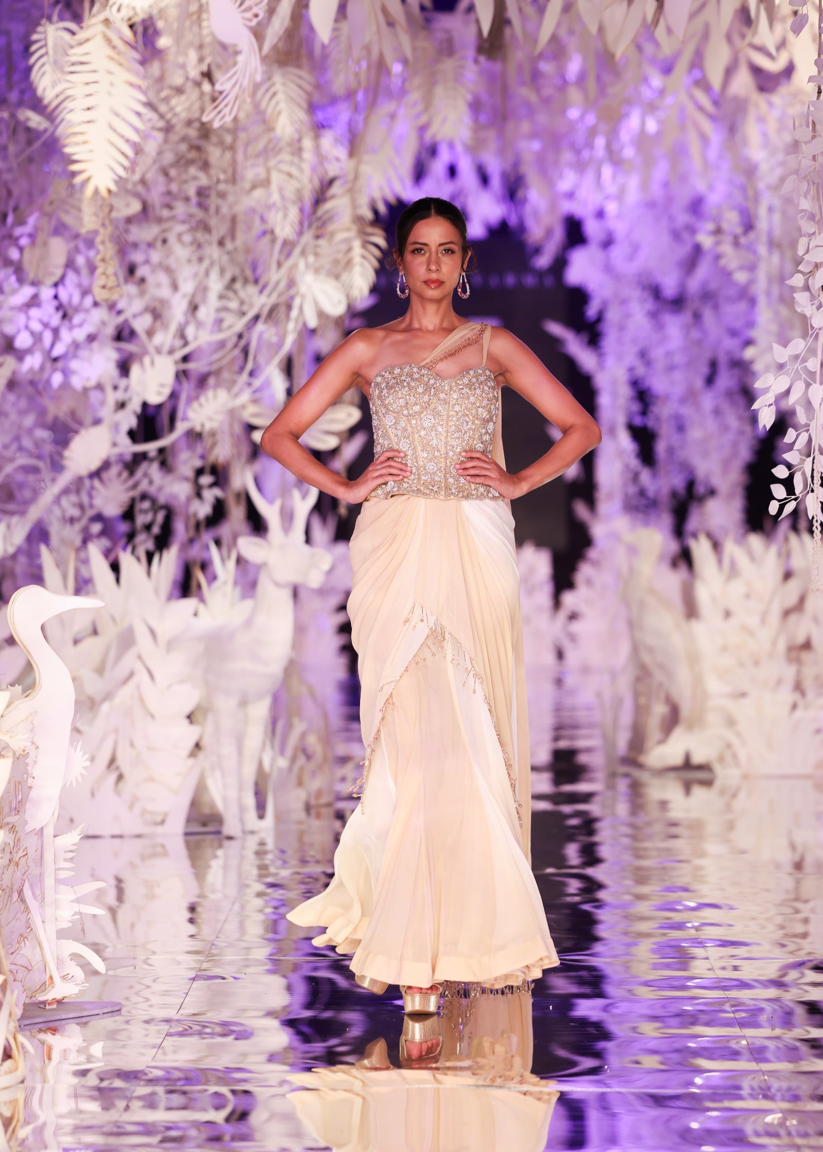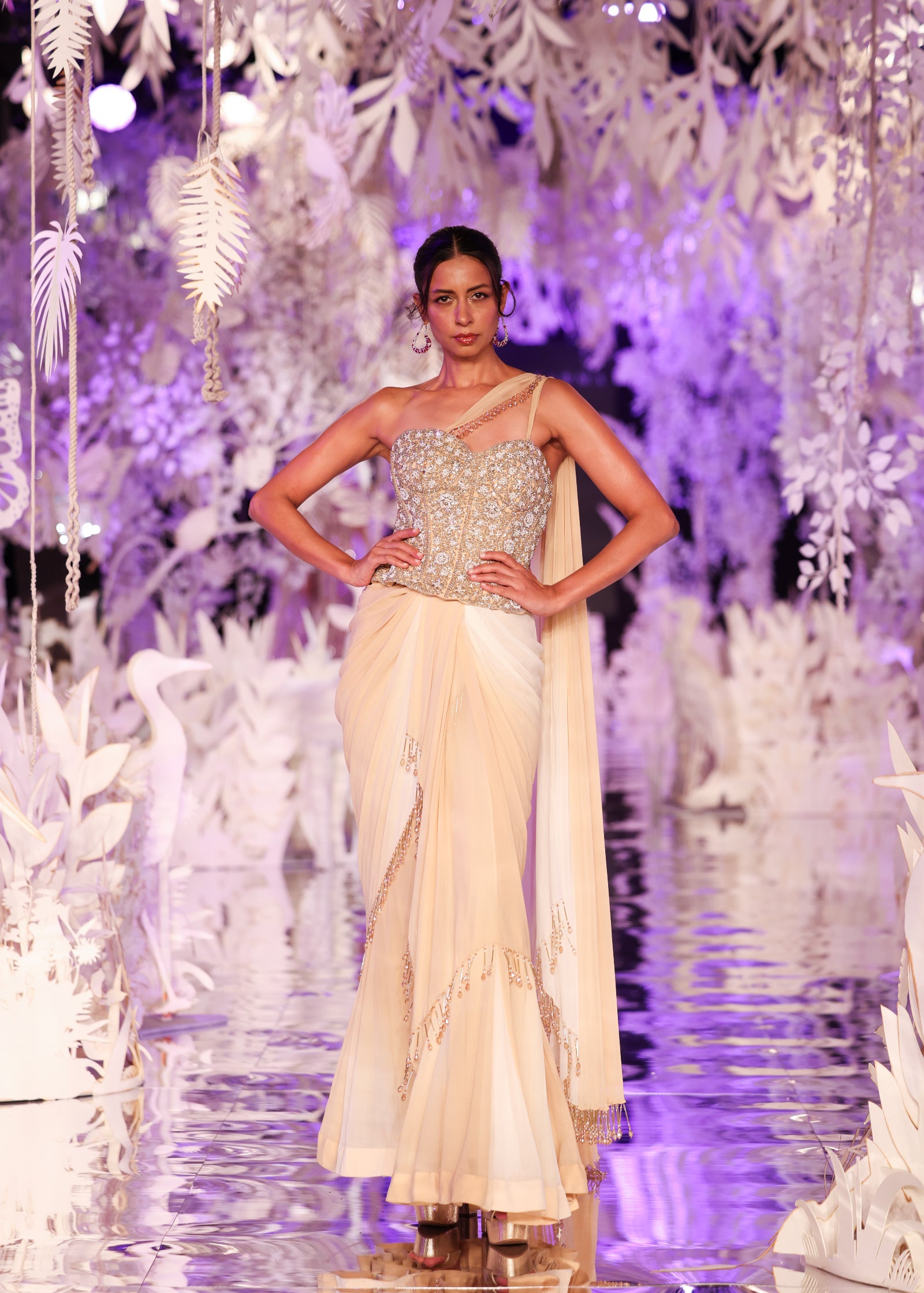 A chic ivory drape skirt paired with a heavily embellished corset blouse, featuring intricate crystal and sequin work. The fluid drape is finished with delicate fringe details, adding movement and sparkle. A modern, glamorous look perfect for cocktail nights or sangeet celebrations.