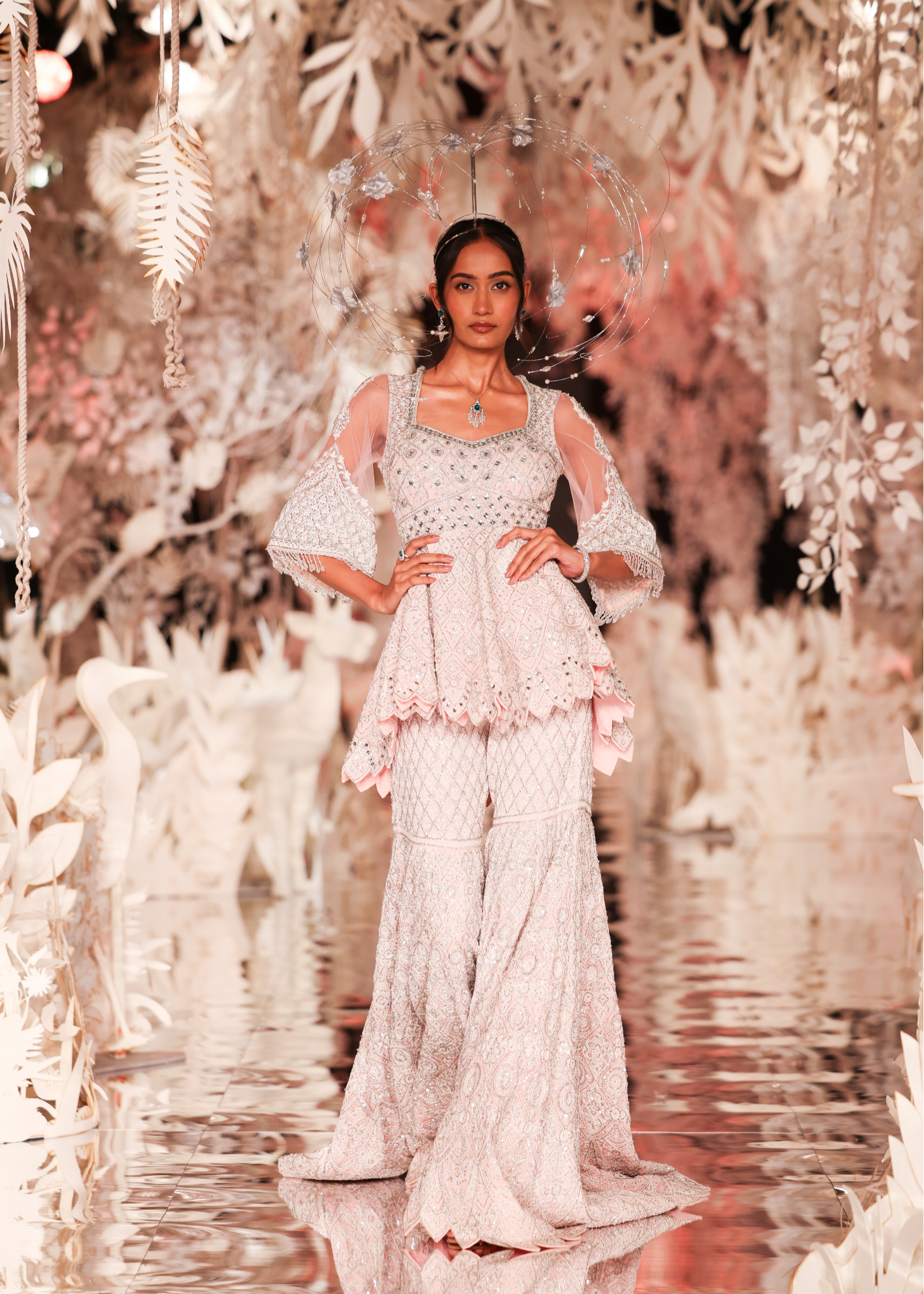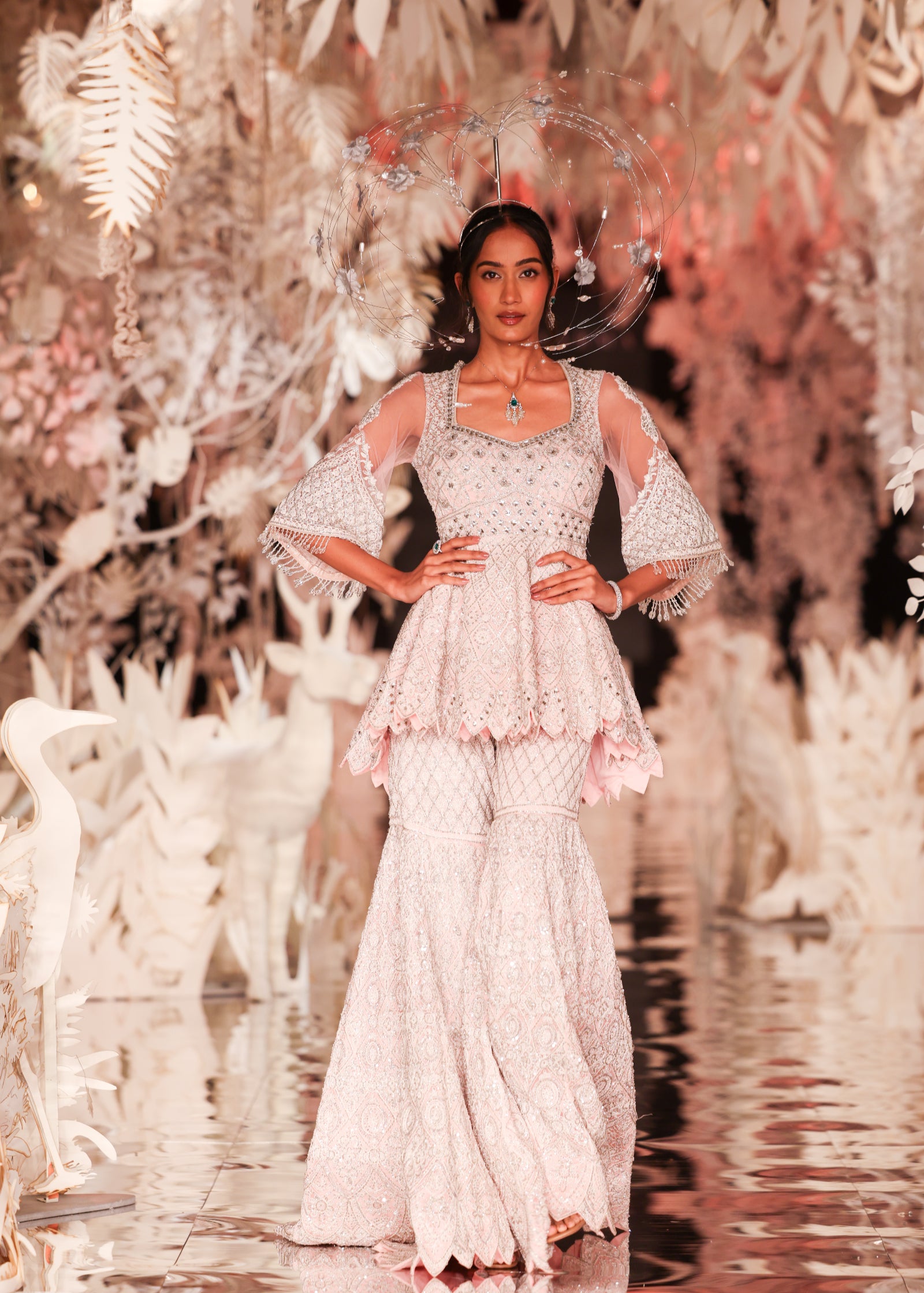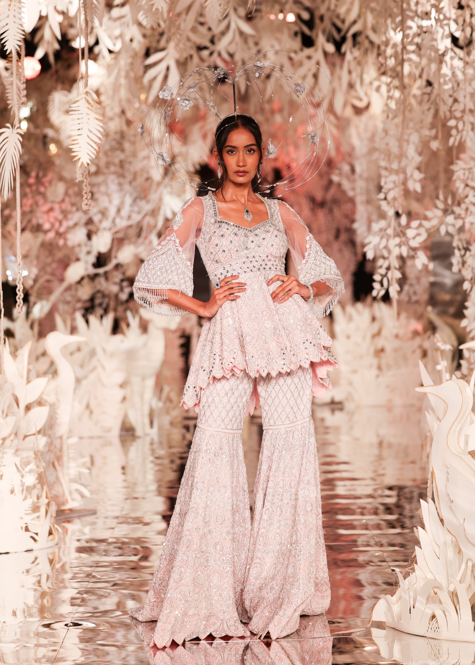A stunning two-piece ensemble featuring a short peplum-style kurta with a scalloped hem and dramatic bell sleeves with layered beaded fringe. Both the kurta and the garara are heavily embellished with a striking geometric and floral pattern in silver and white on a soft pink base. This outfit is a modern and elegant choice for a sangeet or reception.