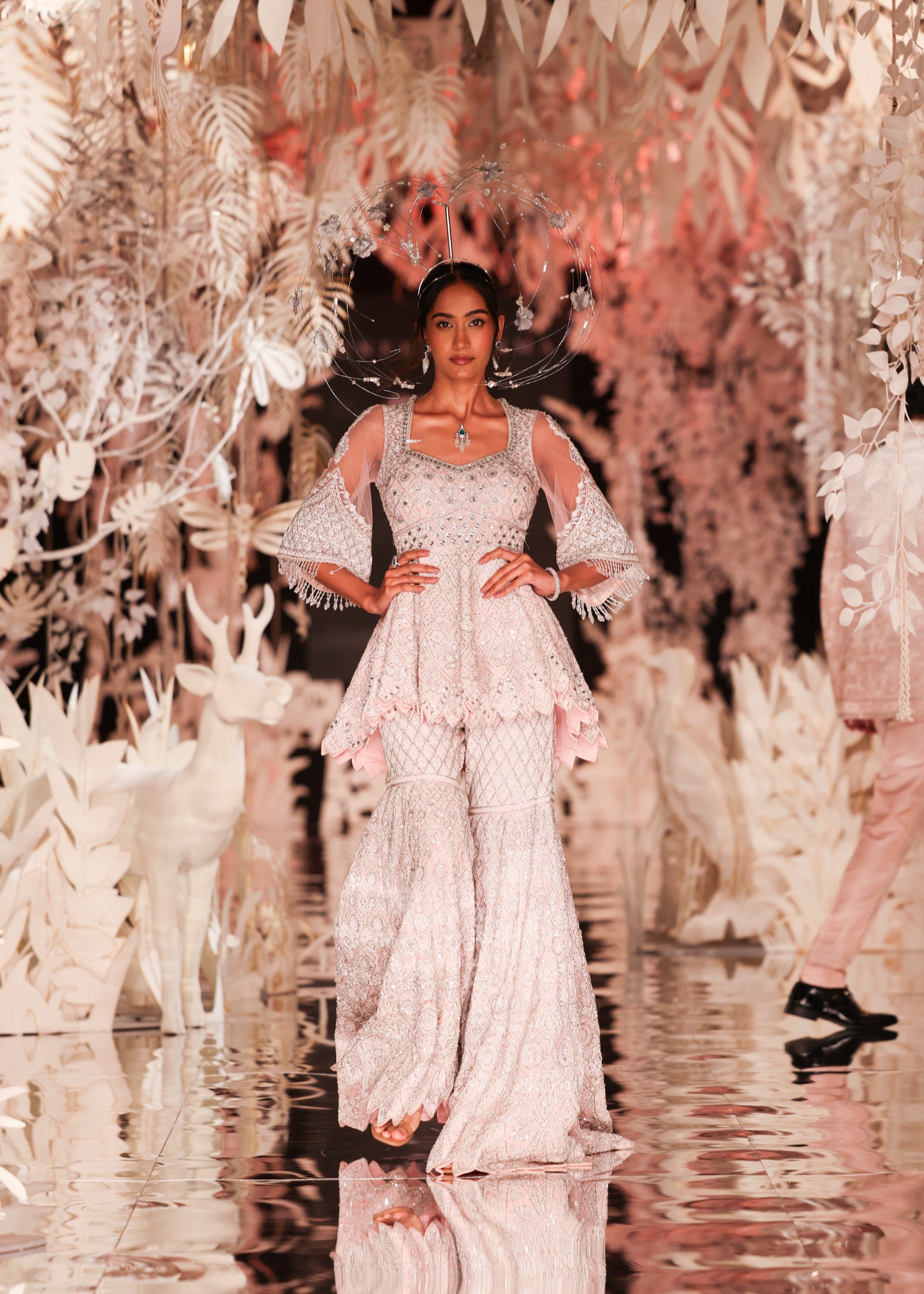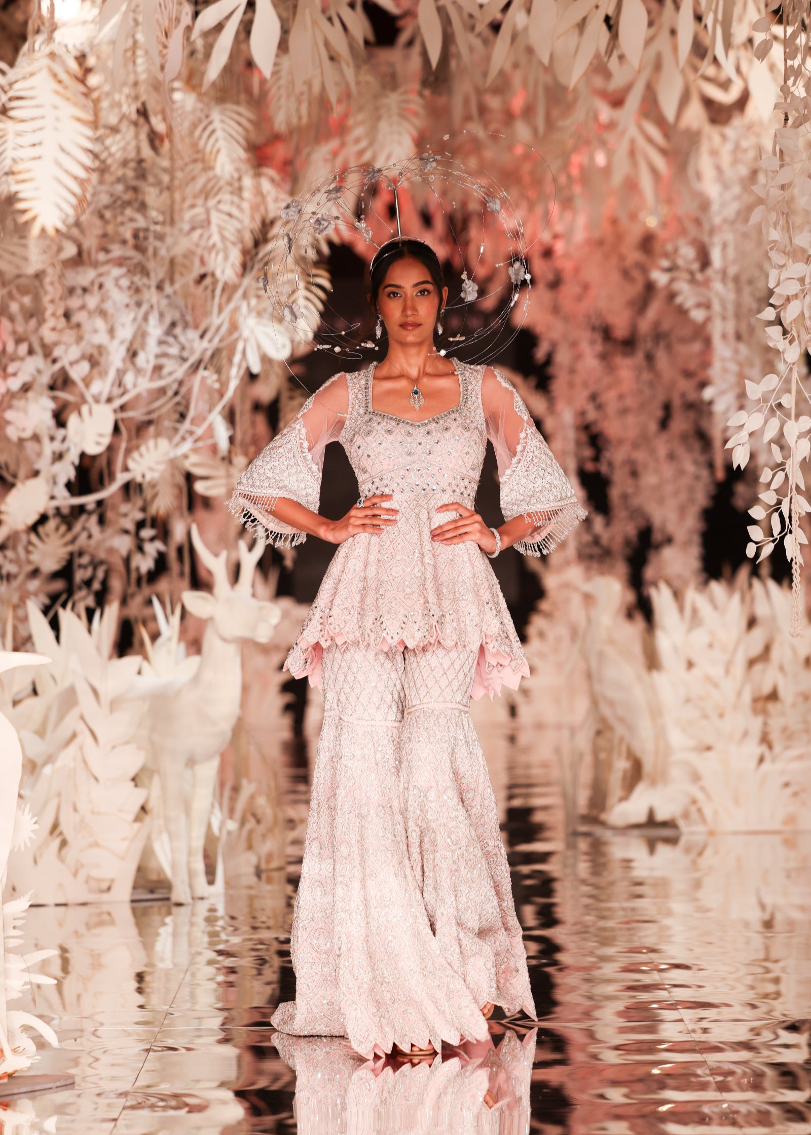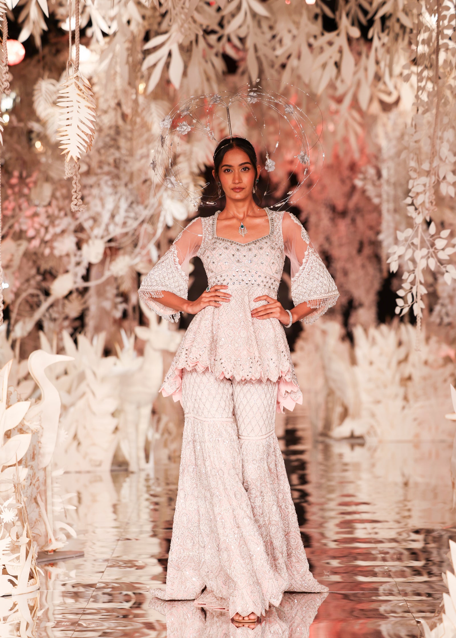 A stunning two-piece ensemble featuring a short peplum-style kurta with a scalloped hem and dramatic bell sleeves with layered beaded fringe. Both the kurta and the garara are heavily embellished with a striking geometric and floral pattern in silver and white on a soft pink base. This outfit is a modern and elegant choice for a sangeet or reception.
