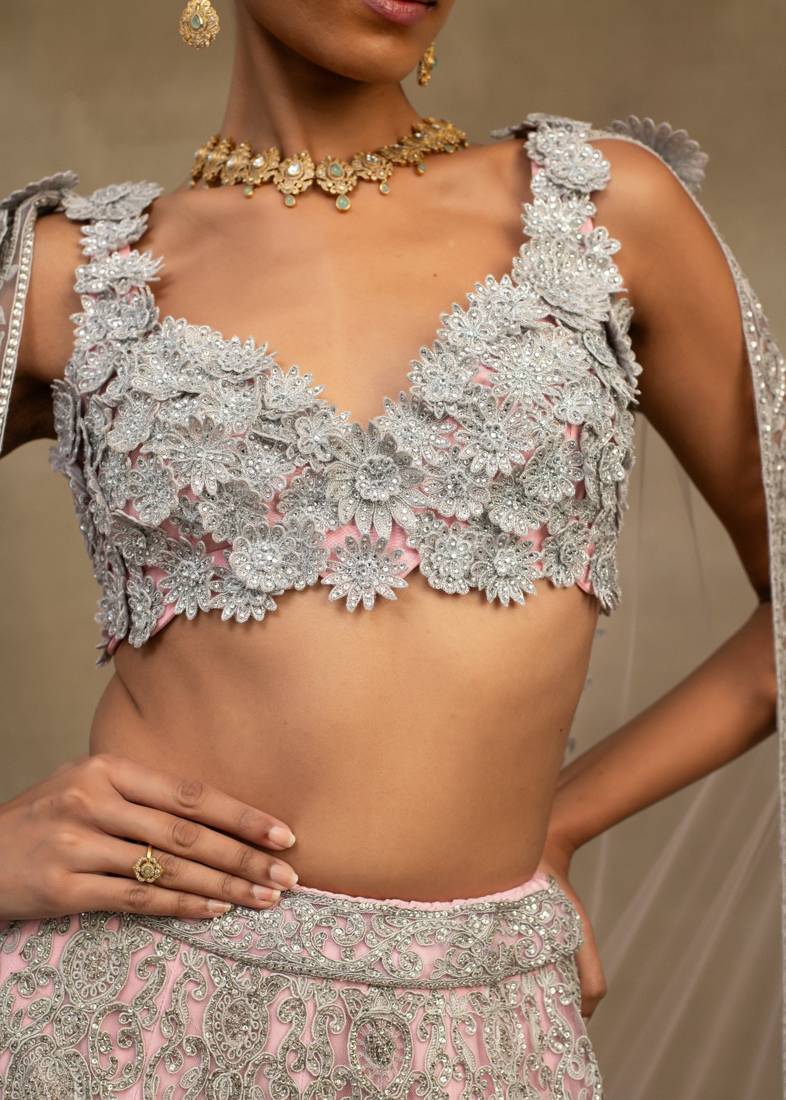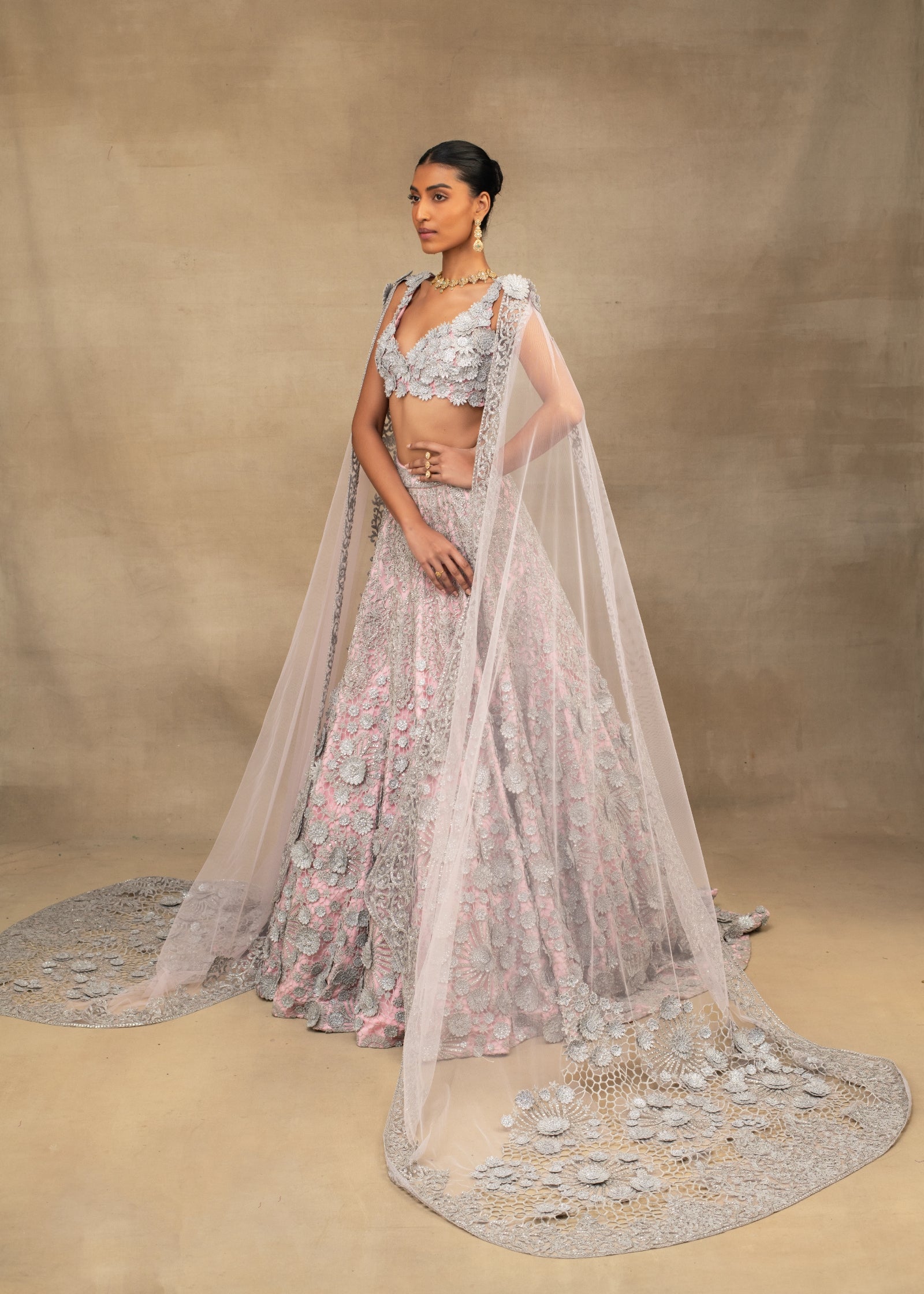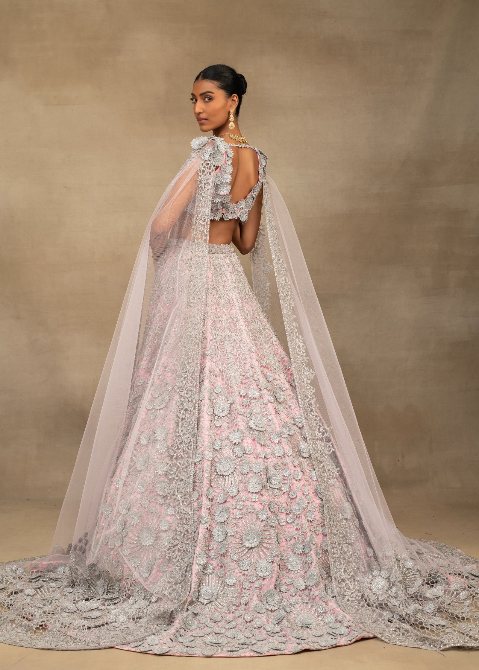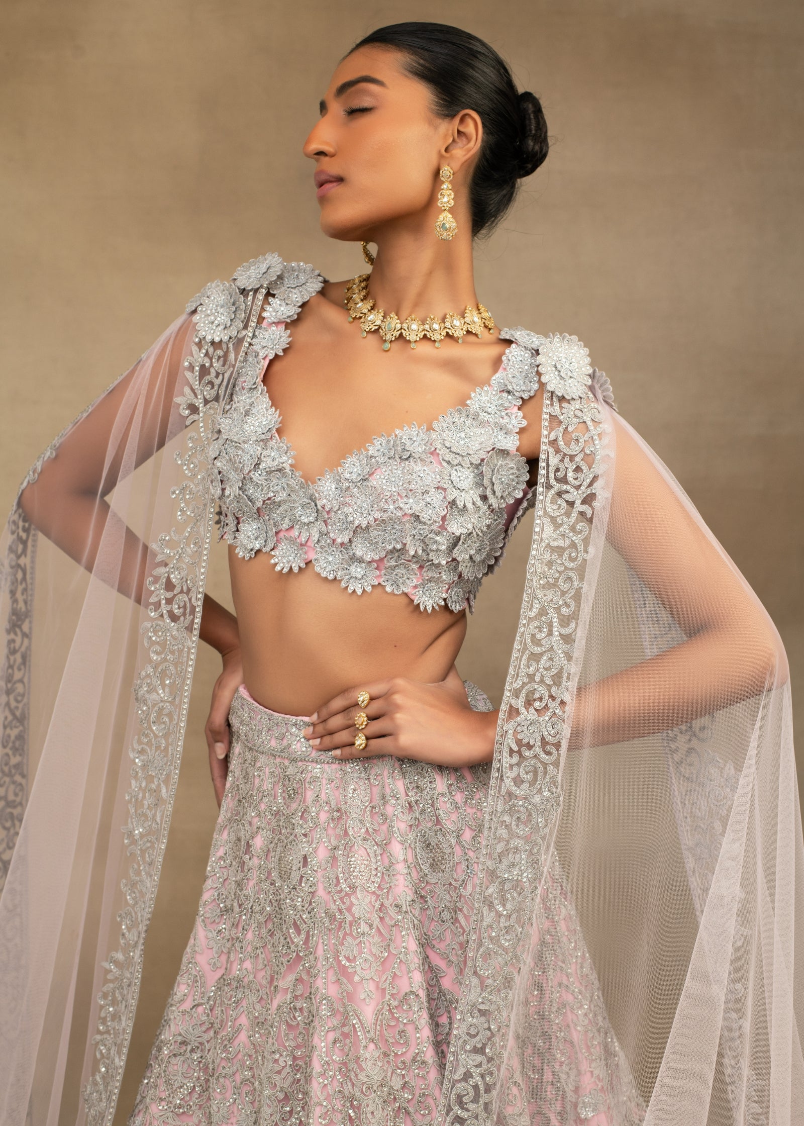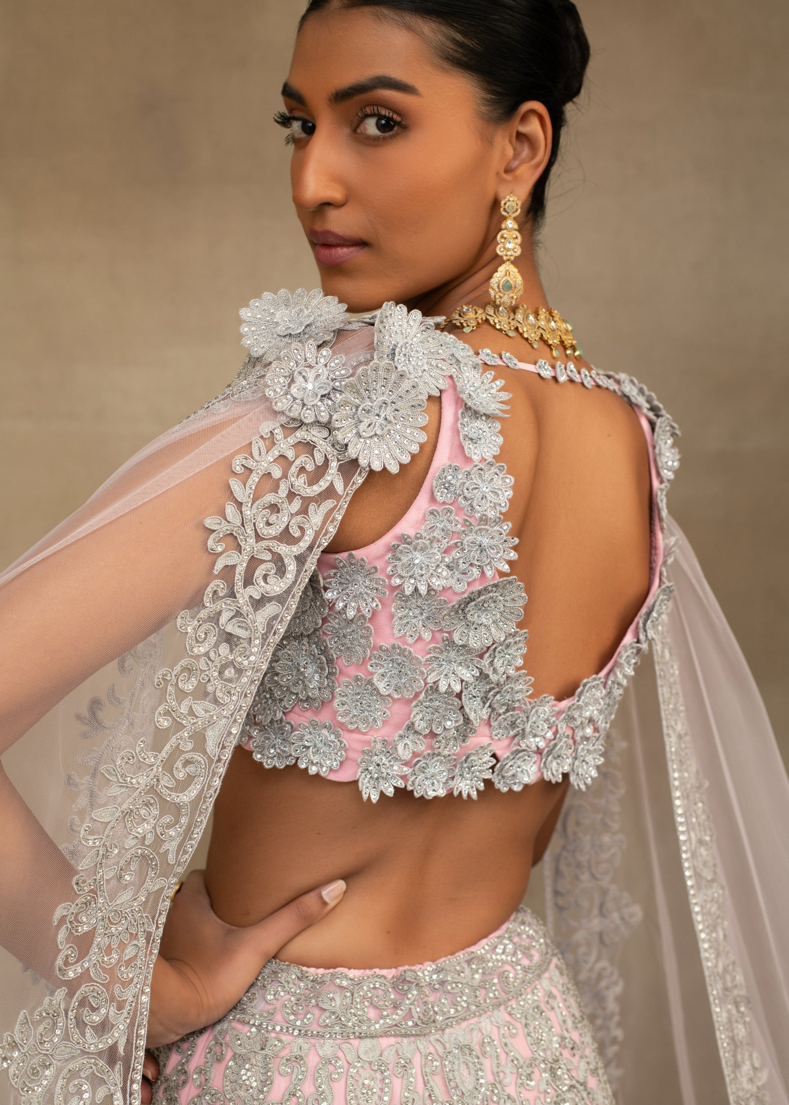 Pink 3D Floral Embroidered Lehenga and Blouse with Cape