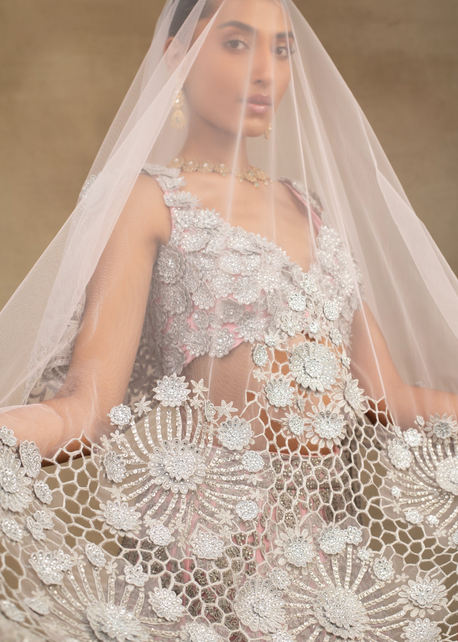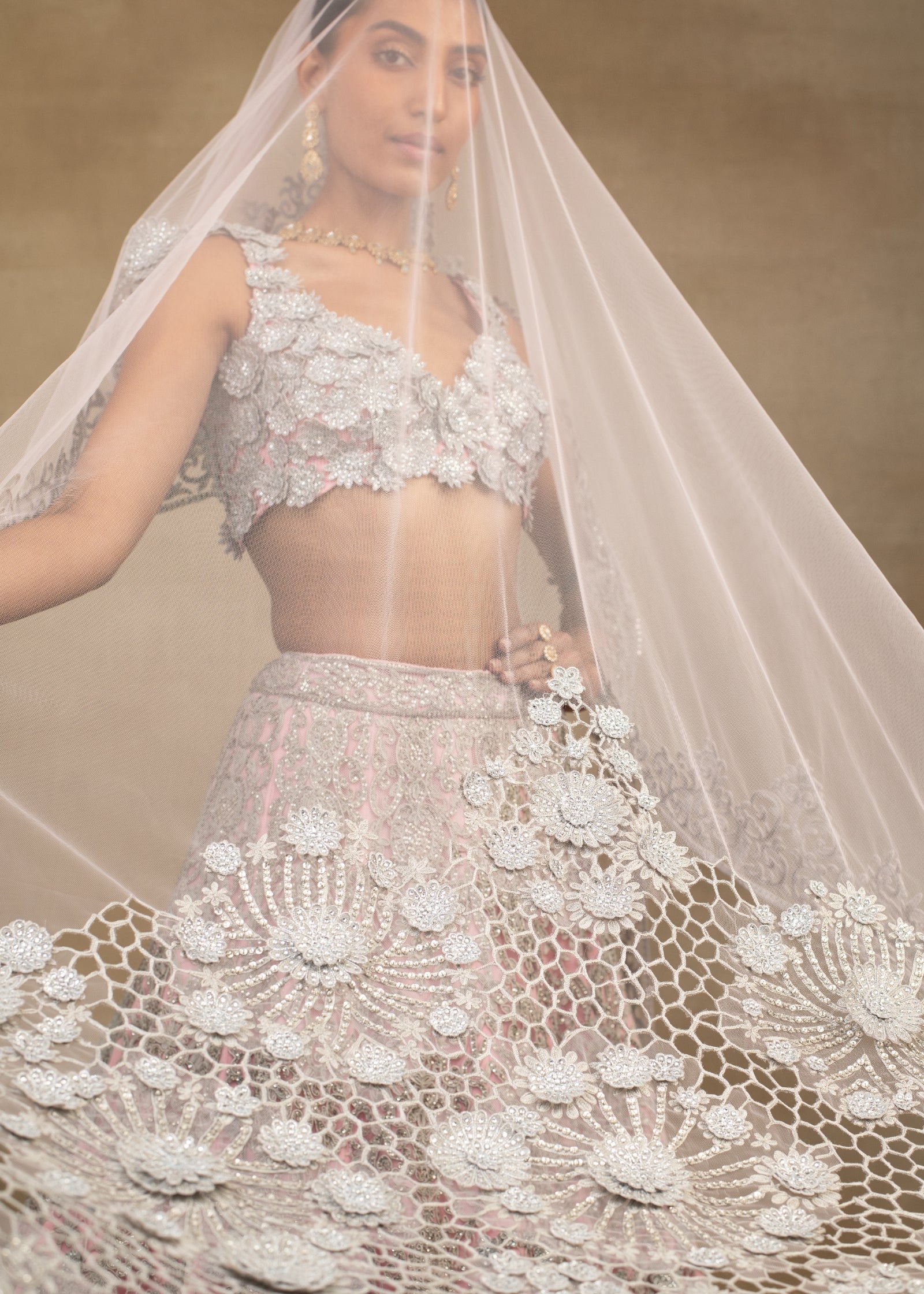 A graceful and glamorous lehenga set featuring a flared skirt adorned with intricate silver and white floral embroidery on a soft pink base. The set includes a striking crop top with a plunging neckline and unique beaded fringe straps. The ensemble is completed with a sheer, embellished dupatta, making it a beautiful and modern choice for a wedding ceremony.