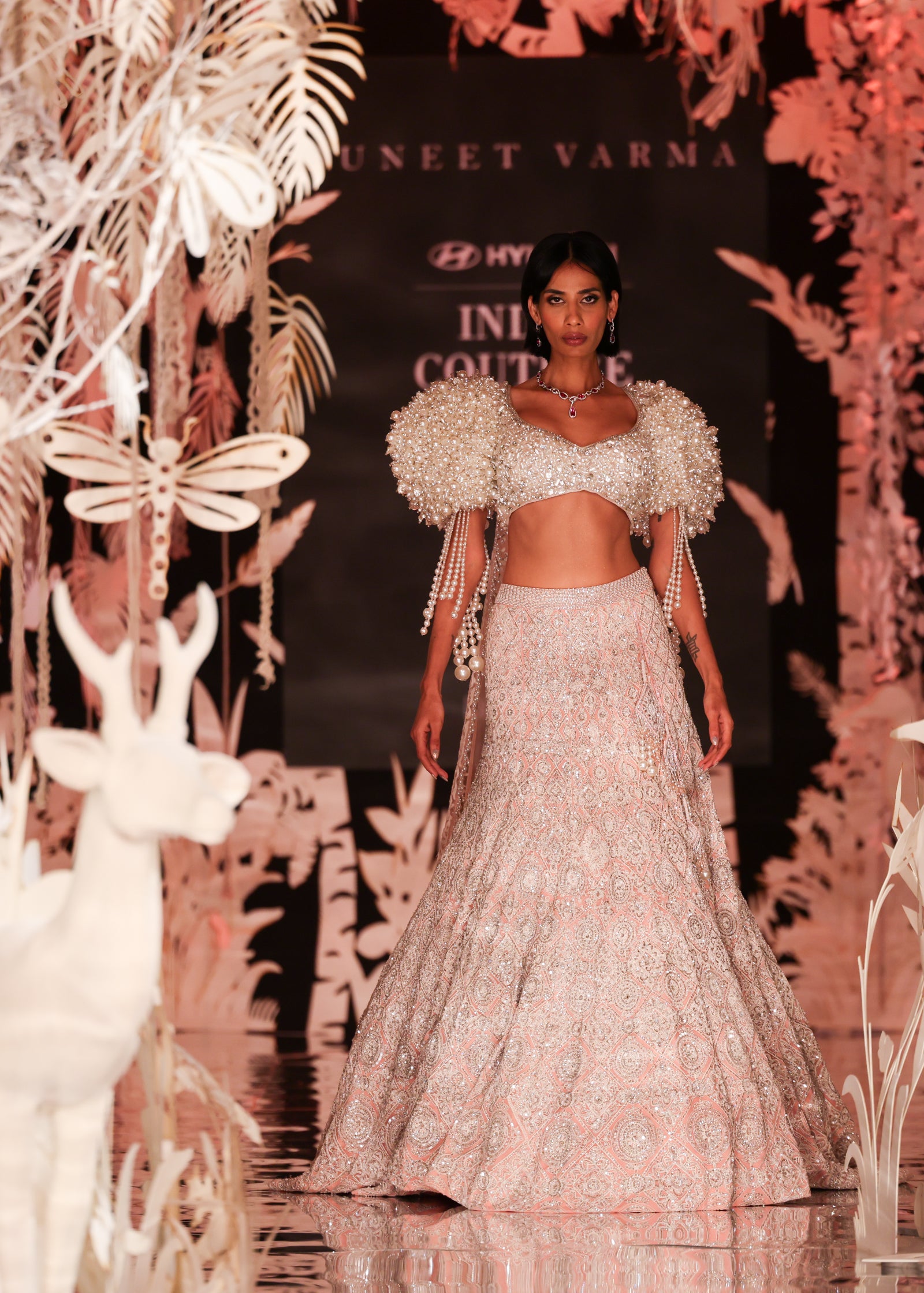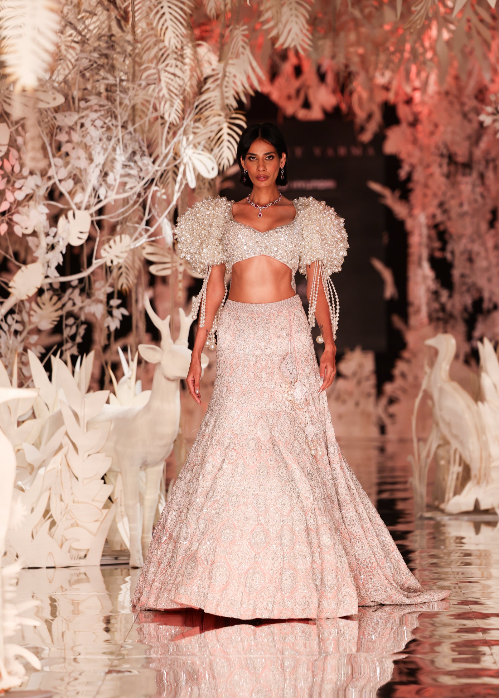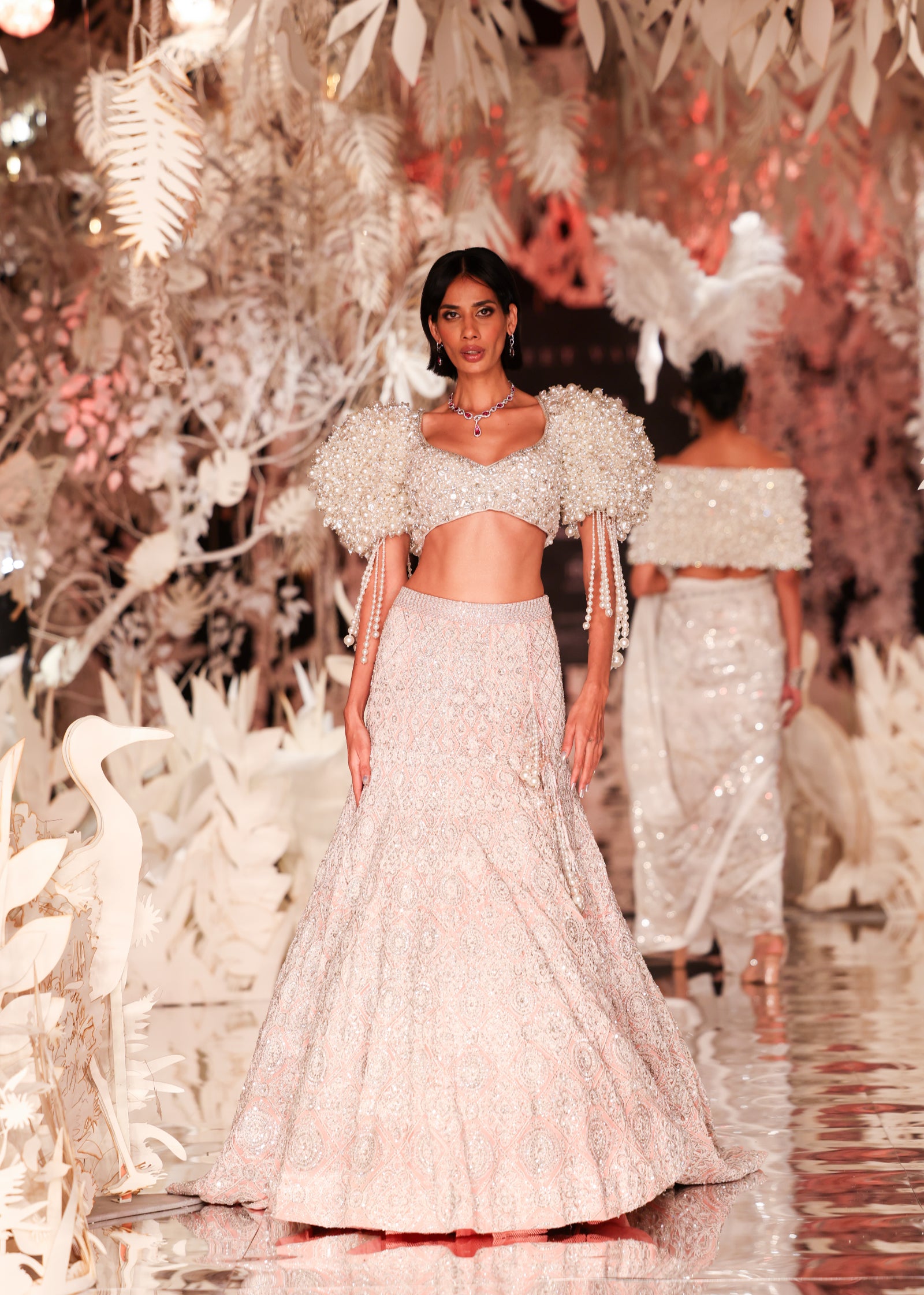 Pink Dori Crystal Lehenga with Pearl-Detailed Blouse and Cascades