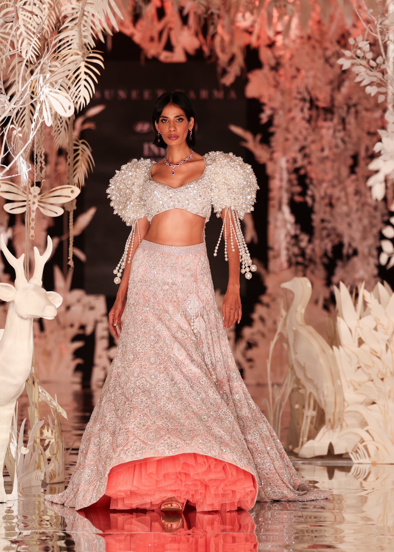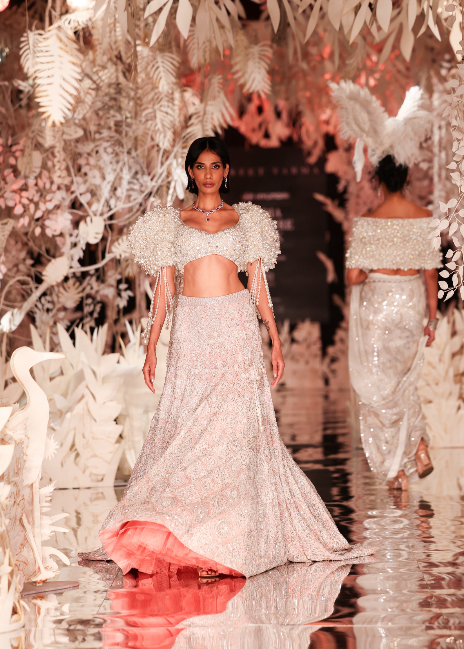 A stunning lehenga set featuring a full, flowing lehenga skirt with a delicate geometric sequin pattern in silver on a soft pink base. The ensemble's focal point is the blouse, which boasts dramatic, voluminous off-shoulder sleeves crafted from clusters of pearl-like beads. This glamorous outfit is a modern classic for a sangeet or engagement ceremony.