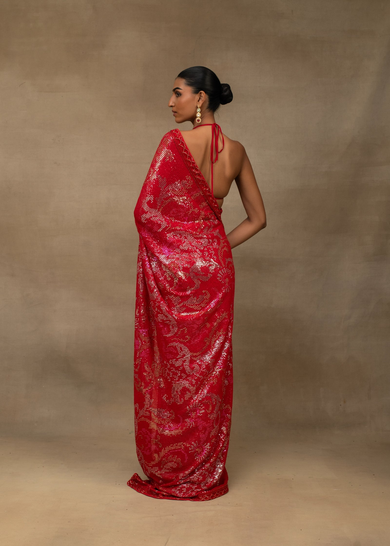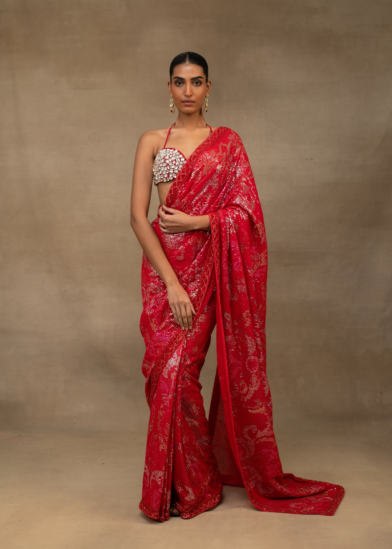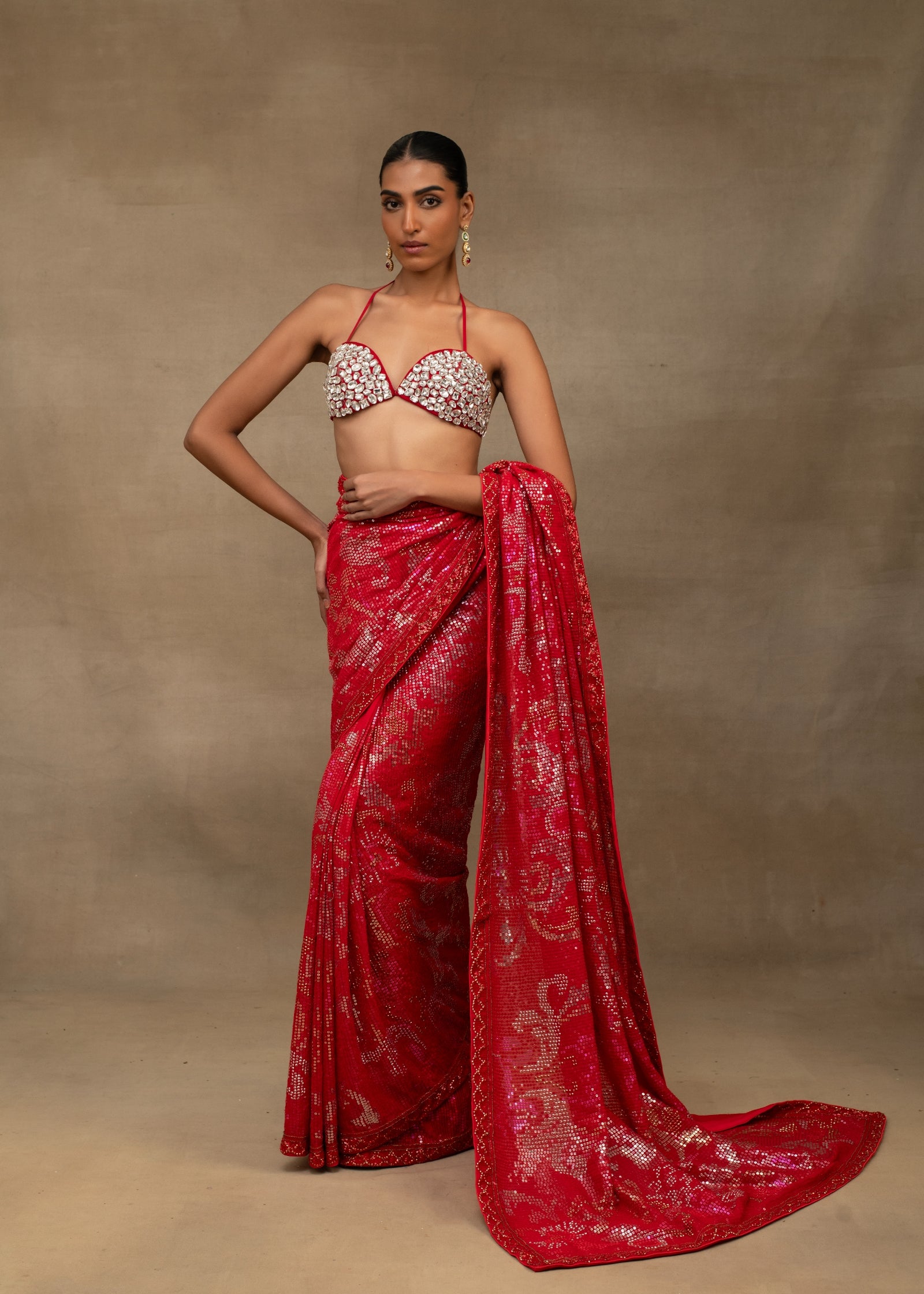 Ruby Red Sequin Embroidered Saree with Embellished Bralette