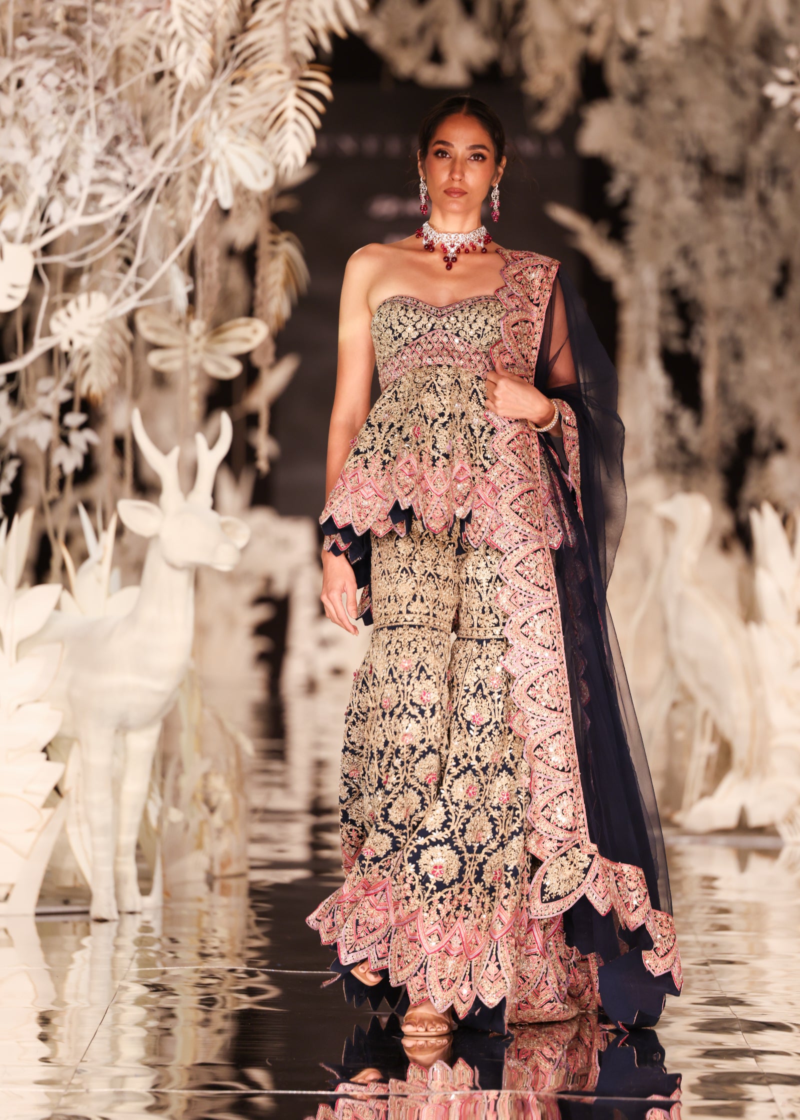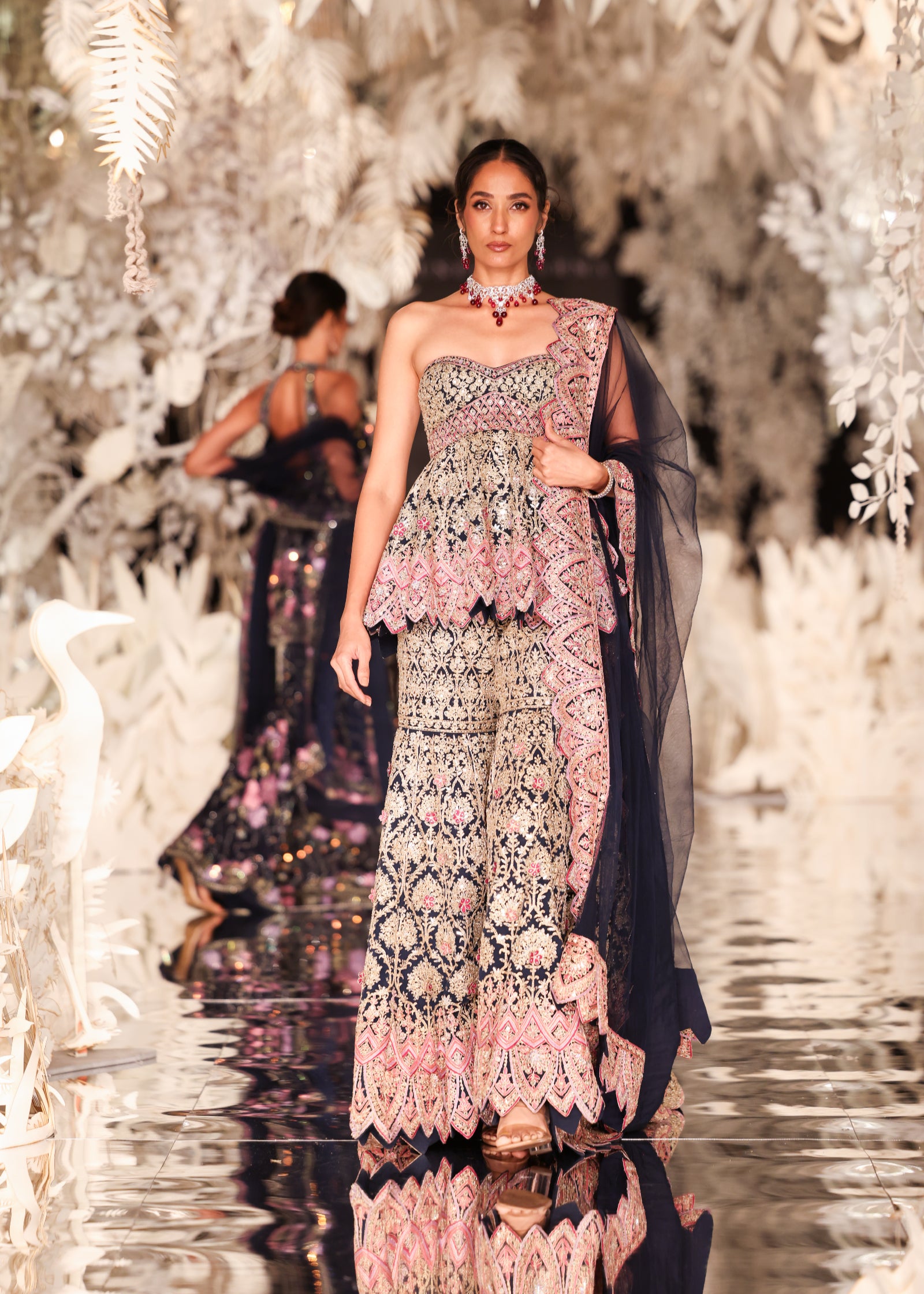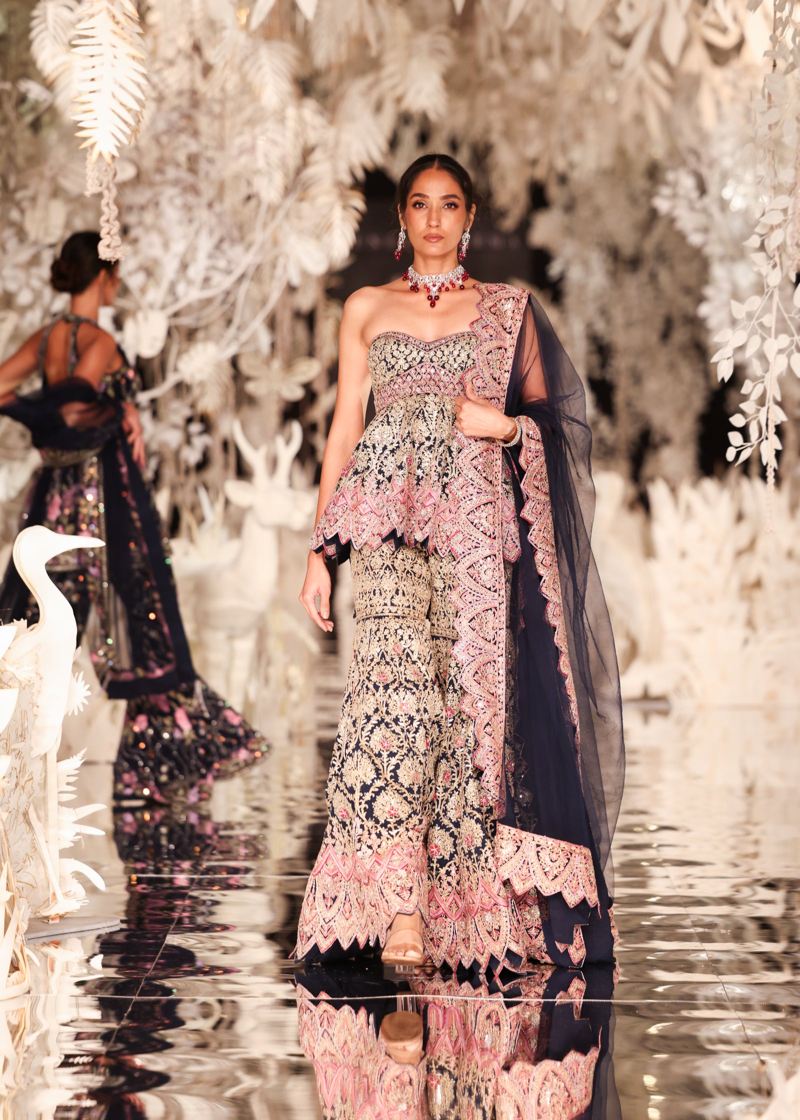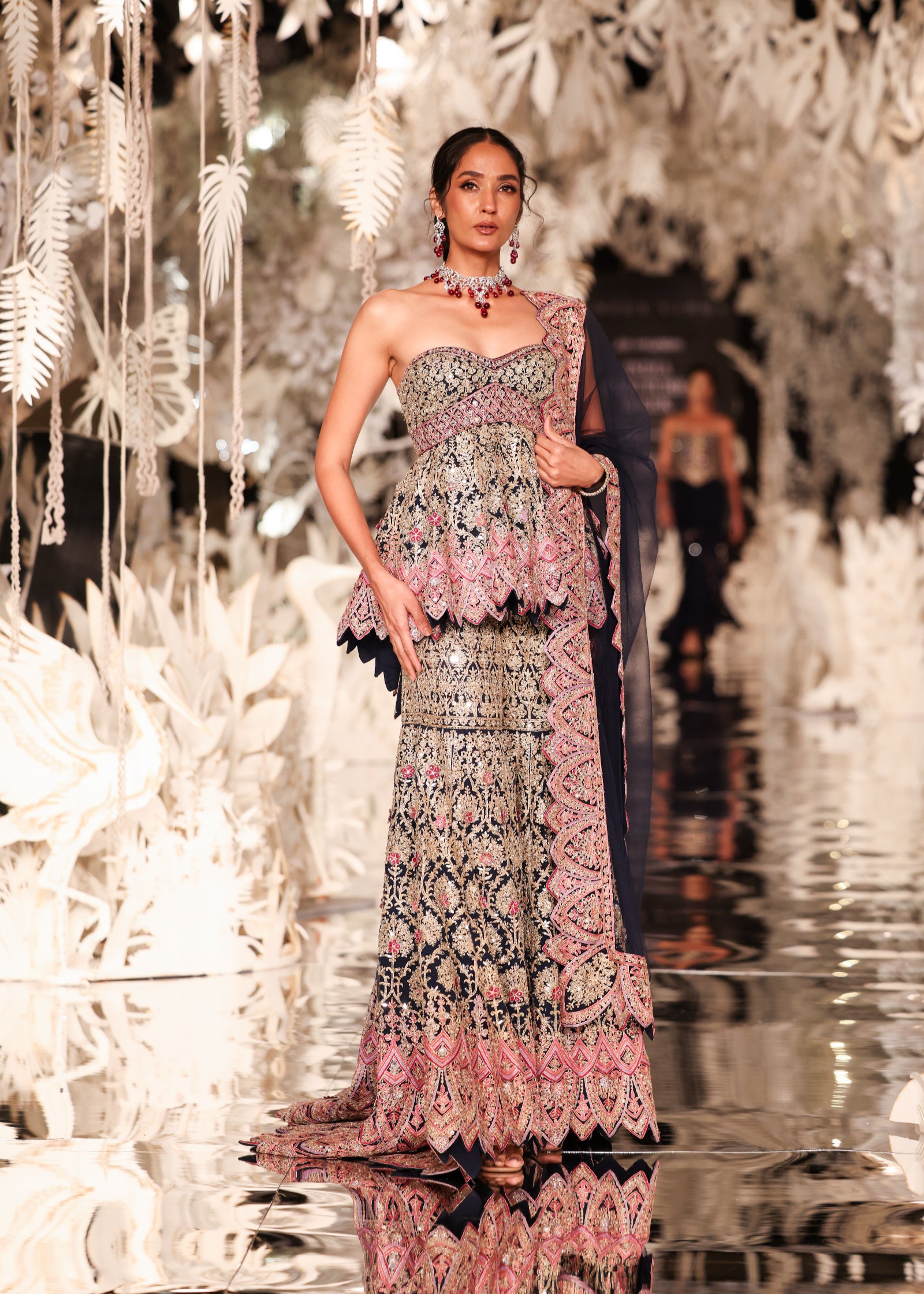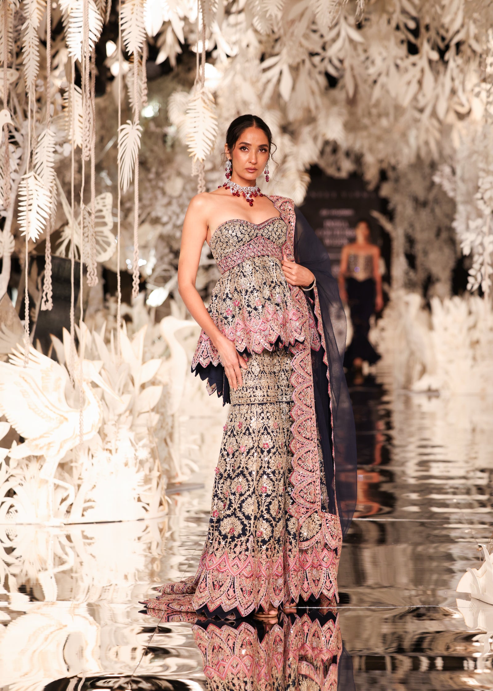 A stunning garara set featuring a modern, strapless peplum top with a scalloped hem. Heavily embroidered with an intricate mosaic-like pattern in shades of pink, gold, and silver on a dark base. A delicate, sheer dupatta with a matching border completes the look. This outfit is ideal for a wedding reception or a formal festive celebration.